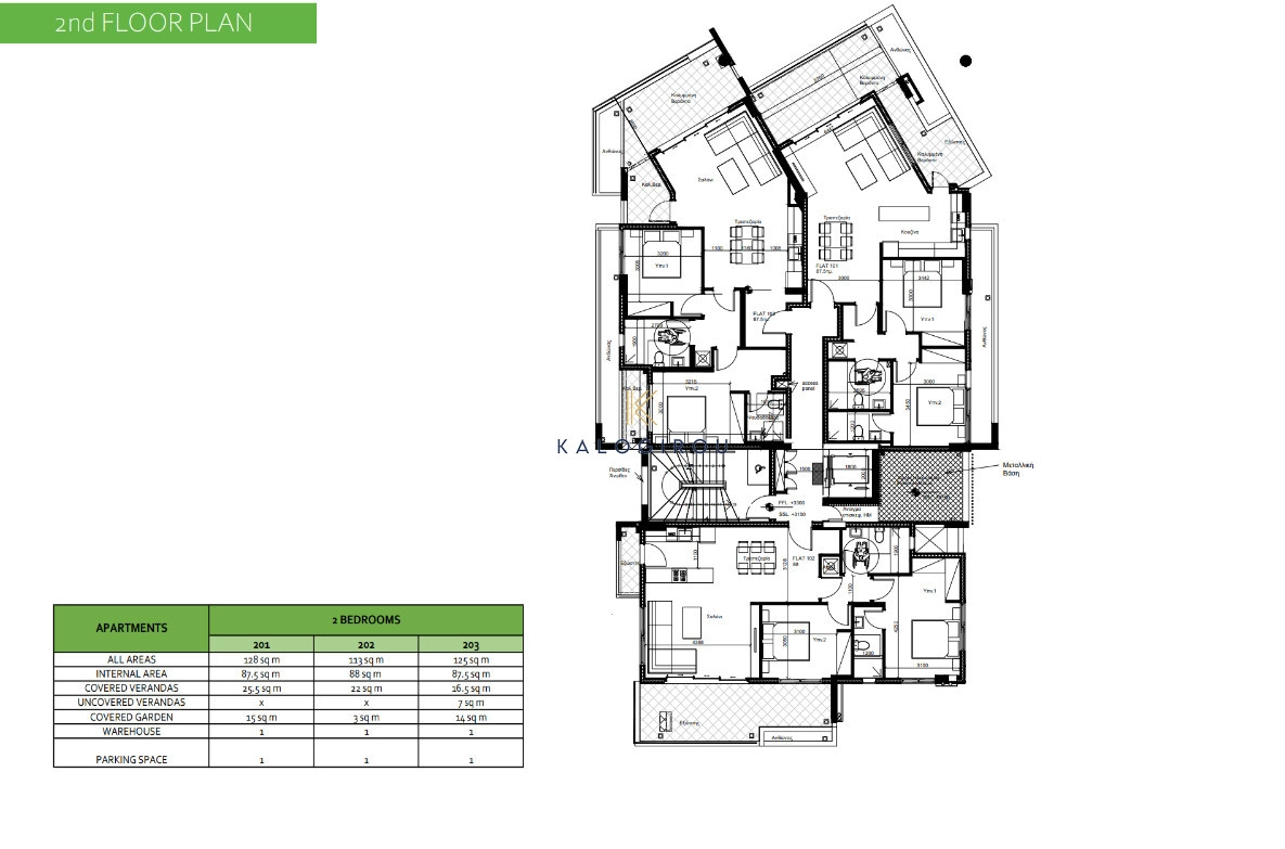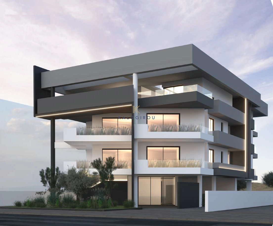 Apartment for sale in Strovolos area, Nicosia. It consists of an open plan kitchen, living, dining area, a main bathroom, two bedrooms, one of them en suite and covered veranda. The apartment is on the second floor with internal covered area of 87.5 sqm and 25.5 sqm covered veranda. In addition, the property has access to a storage room and covered parking on the ground floor.