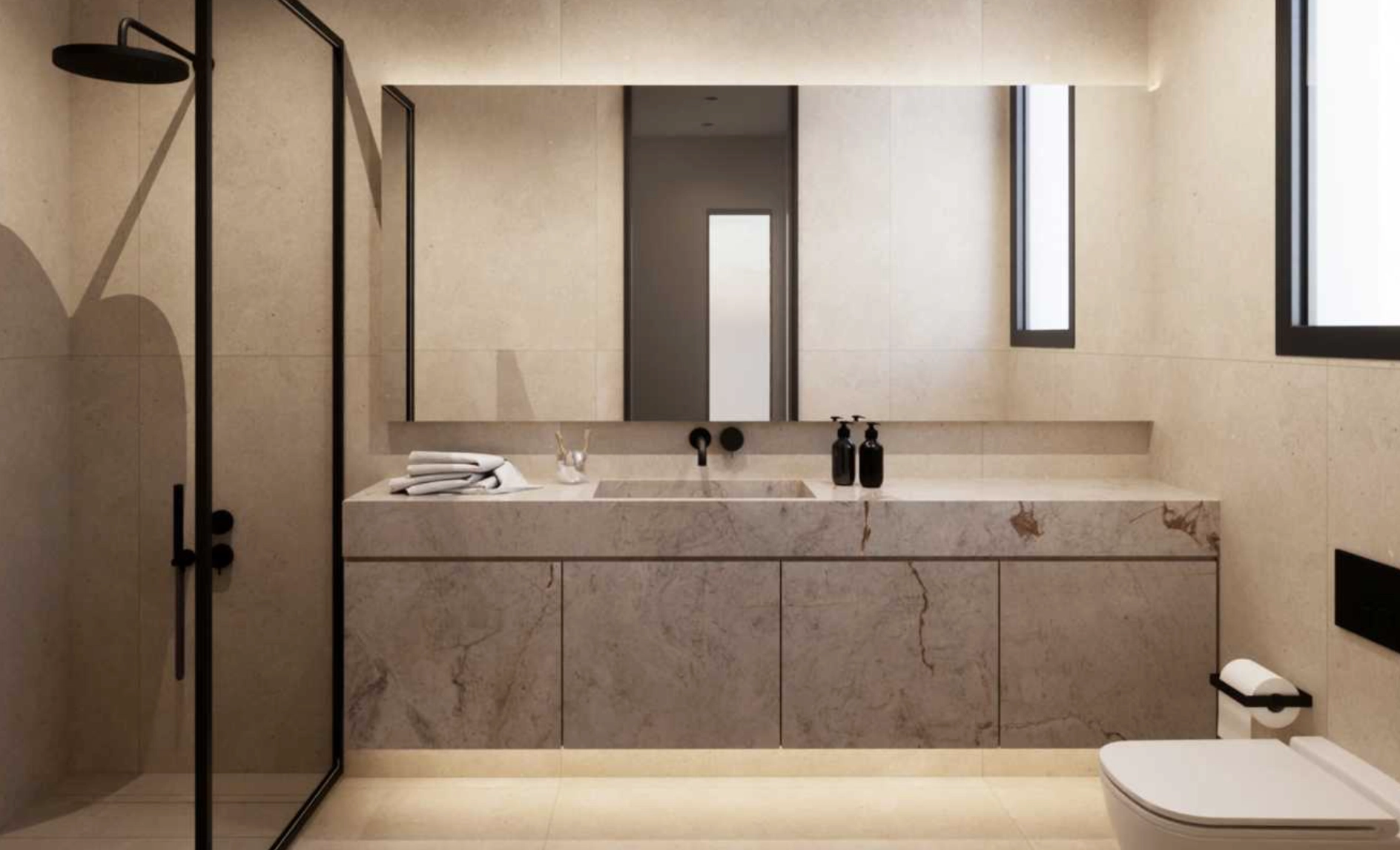 A spacious open-plan kitchen, dining, and living area opens to landscaped gardens, a skimmer pool with a water curtain, and a fully equipped BBQ area. A guest toilet, external storage room, and outdoor bathroom enhance the functionality of this level.