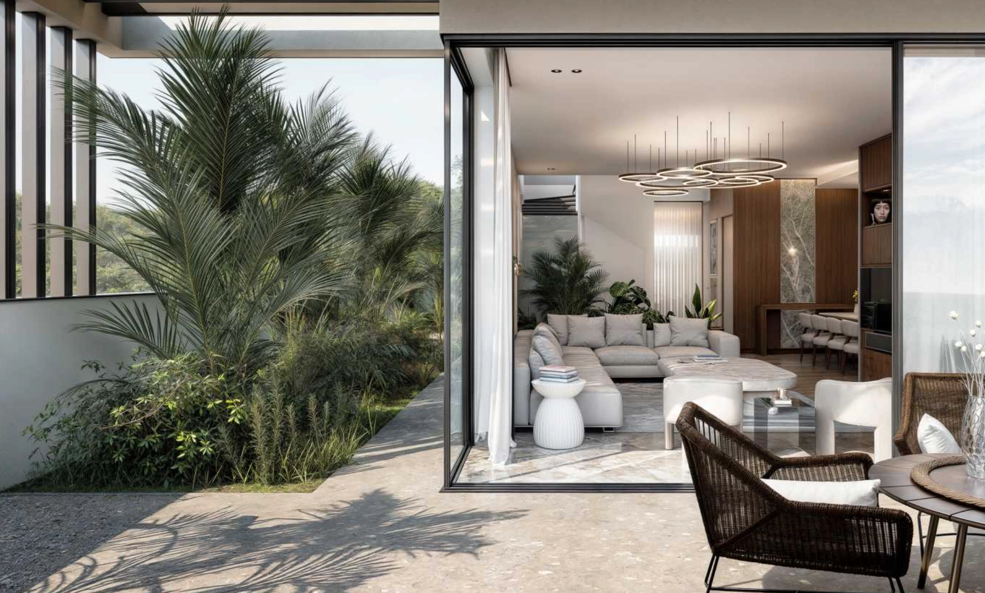 A spacious open-plan kitchen, dining, and living area opens to landscaped gardens, a skimmer pool with a water curtain, and a fully equipped BBQ area. A guest toilet, external storage room, and outdoor bathroom enhance the functionality of this level.