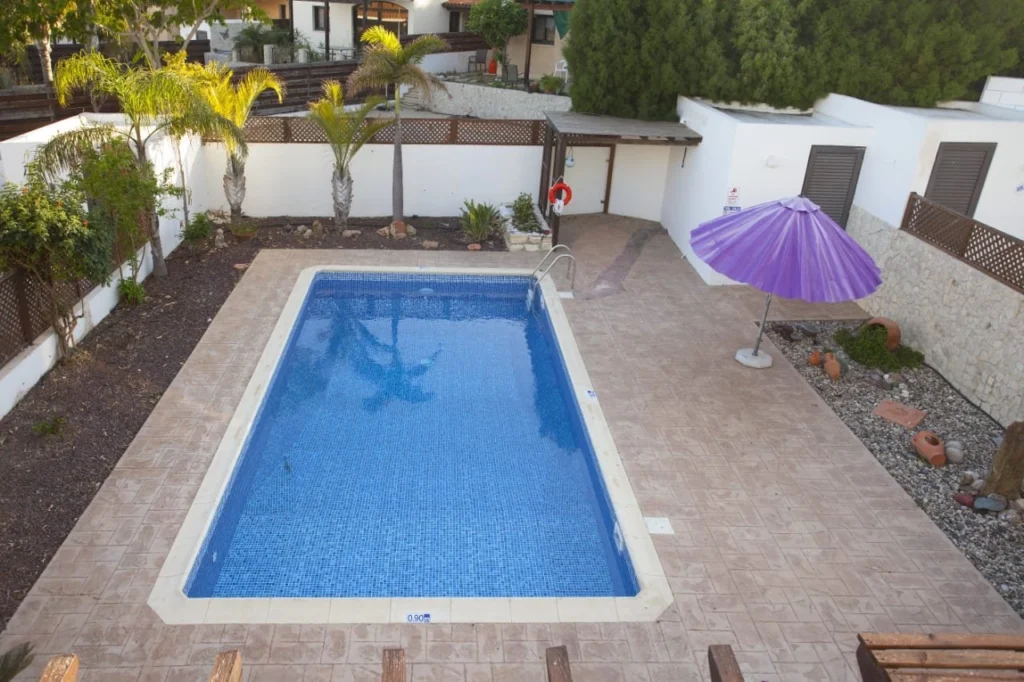 Features include a private pool (only 2 years old), 1 en-suite bedroom, 2 bathrooms + guest toilet, fireplace, AC units throughout, and 2 covered parking spaces.