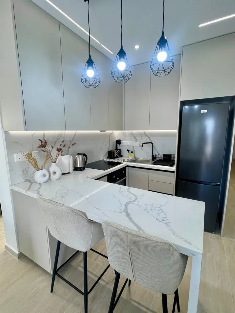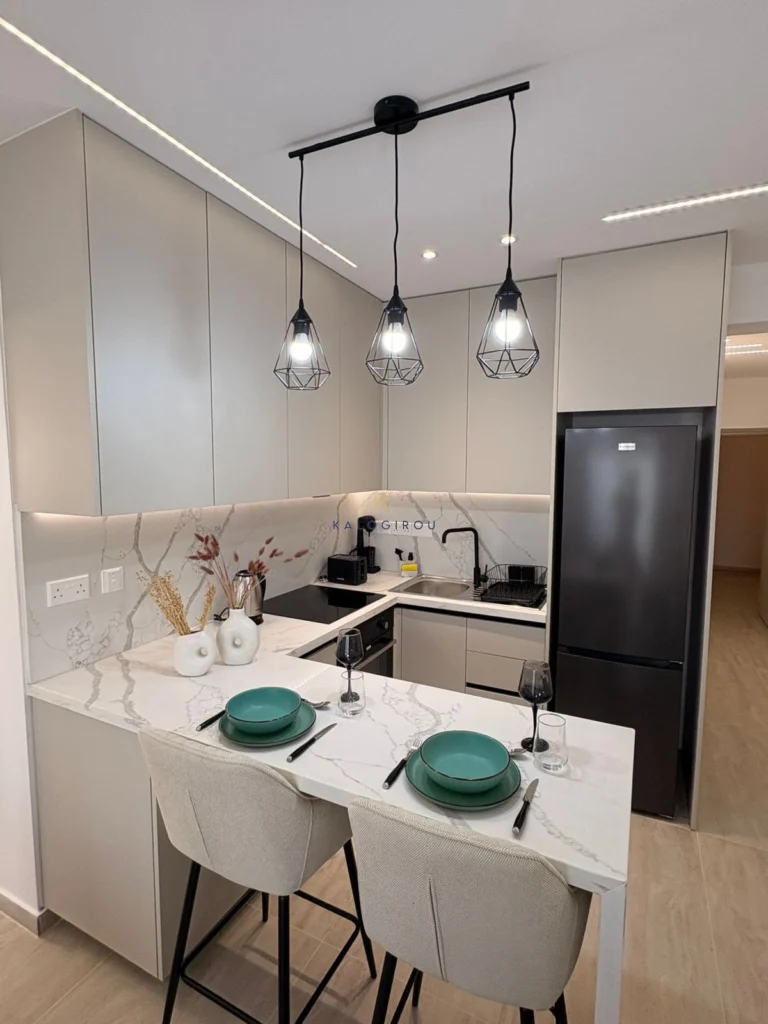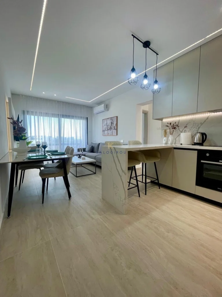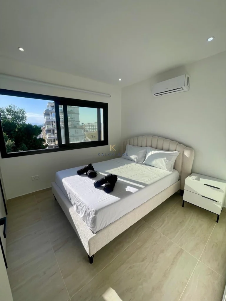 Fifth floor apartment for sale in Makenzy Larnaca. It is fully renovated & equipped with a/c split units. The flat consists of an open plan kitchen-dining-living area, a main bathroom with shower and wc, three bedrooms and covered balcony. Internal covered area is 72 sqm and covered balcony is 6 sqm.