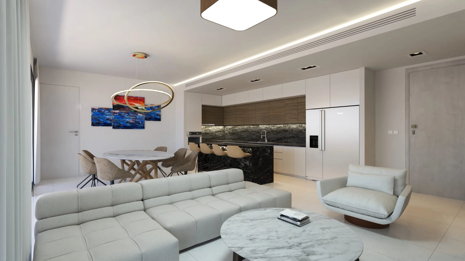 Luxury apartment for sale in a new residential building. On the ground floor there are 5 single apartments of 50 m2 with a covered veranda of 10 m2. On the second floor there are 3 double apartments of 80 m2 with covered verandas of 15 m2 and 26 m2. On the third floor there are 2 three-bedroom apartments of 120 m2 with a covered veranda of 30 m2 and 40 m2. Each apartment on the third floor has a roof garden with a barbecue area, a seating area and a private pool. Each apartment has a parking space, a storage room. Energy class A. The facade and roof are lined with heat-insulating extruded polystyrene foam 8 cm. Thermal insulation aluminum systems made by RABEL with double glass. High-quality class A ceramics, class A plumbing from ROCA, faucets and mechanisms from GROHE are installed inside. Kitchen countertops and sinks made of granite, joinery made of oak melamine. Alarm system, CCTV cameras, entrance gates with controlled access, entrance gates for pedestrians are monitored from each apartment.