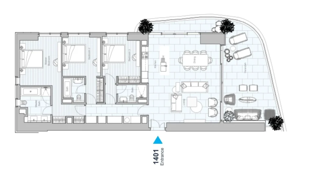 The thoughtful layout includes an open-plan living and dining area, a modern kitchen, three generously sized bedrooms including a master suite with a private bathroom, and expansive outdoor space ideal for relaxing or entertaining.
