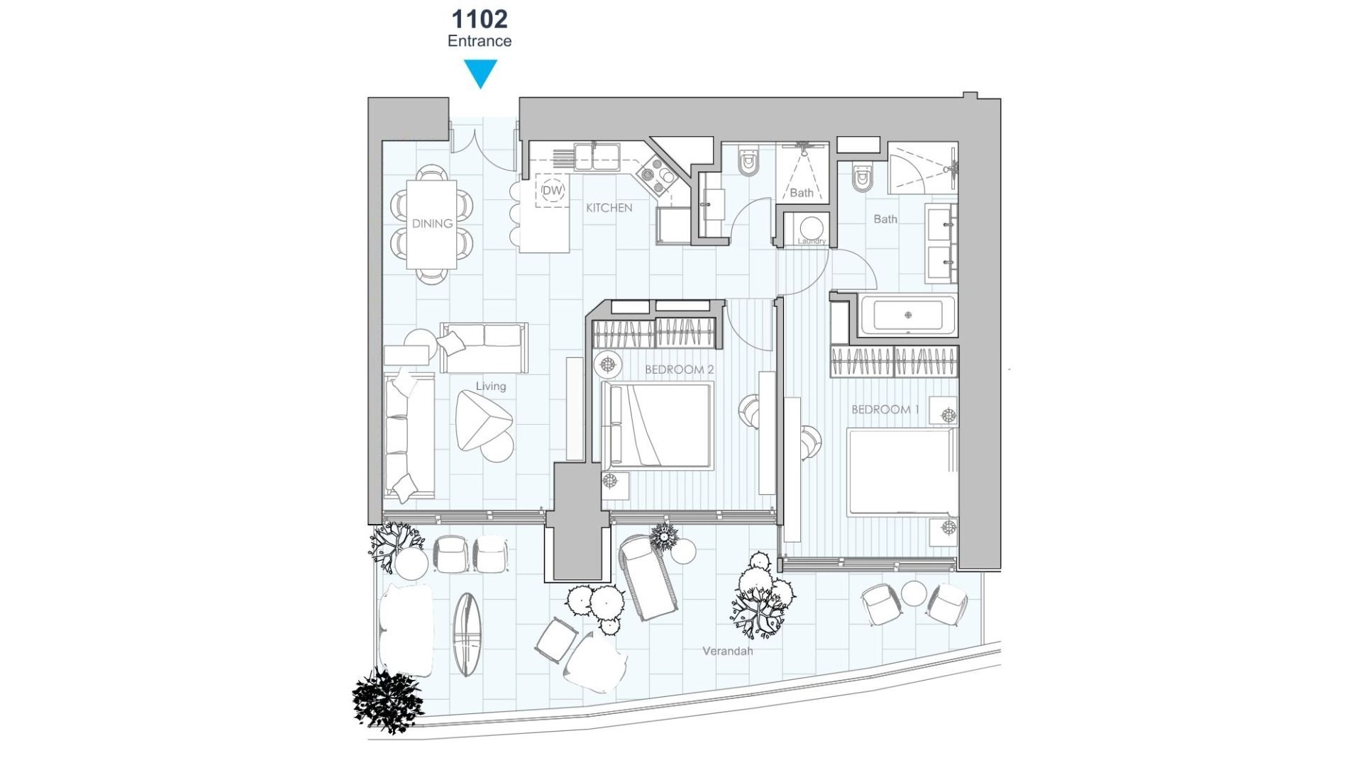 The thoughtful layout includes an open-plan living and dining area, a modern kitchen, two generously sized bedrooms including a master suite with a private bathroom, and expansive outdoor space ideal for relaxing or entertaining.