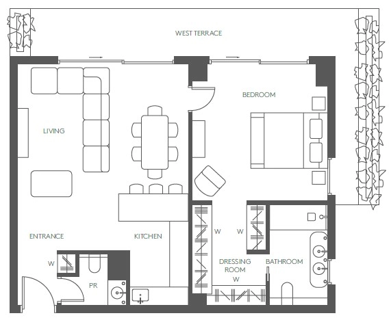The smart layout includes an open-plan living and dining area, a fully equipped contemporary kitchen, a spacious bedroom with ample storage, a sleek bathroom, and a private outdoor terrace perfect for relaxing or entertaining.