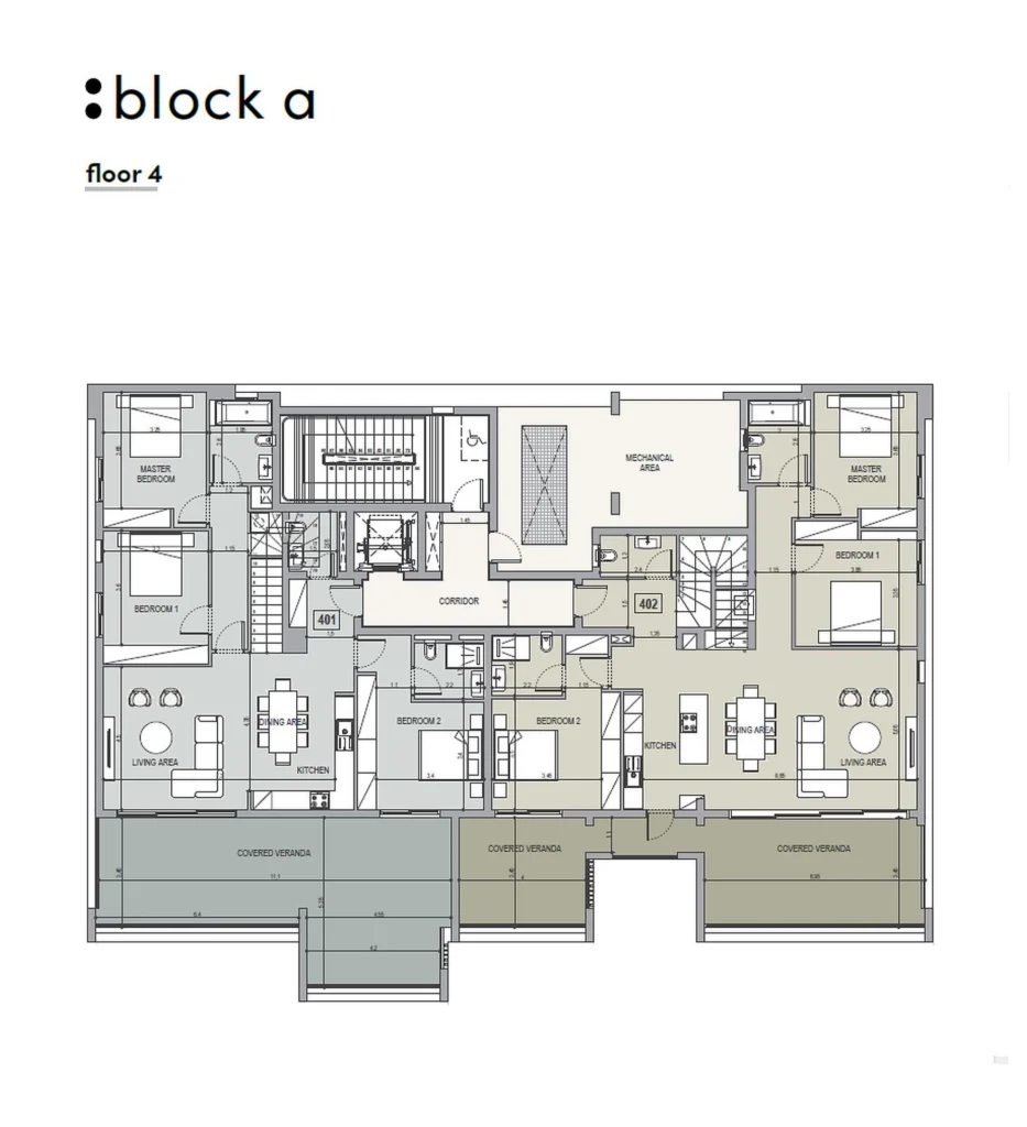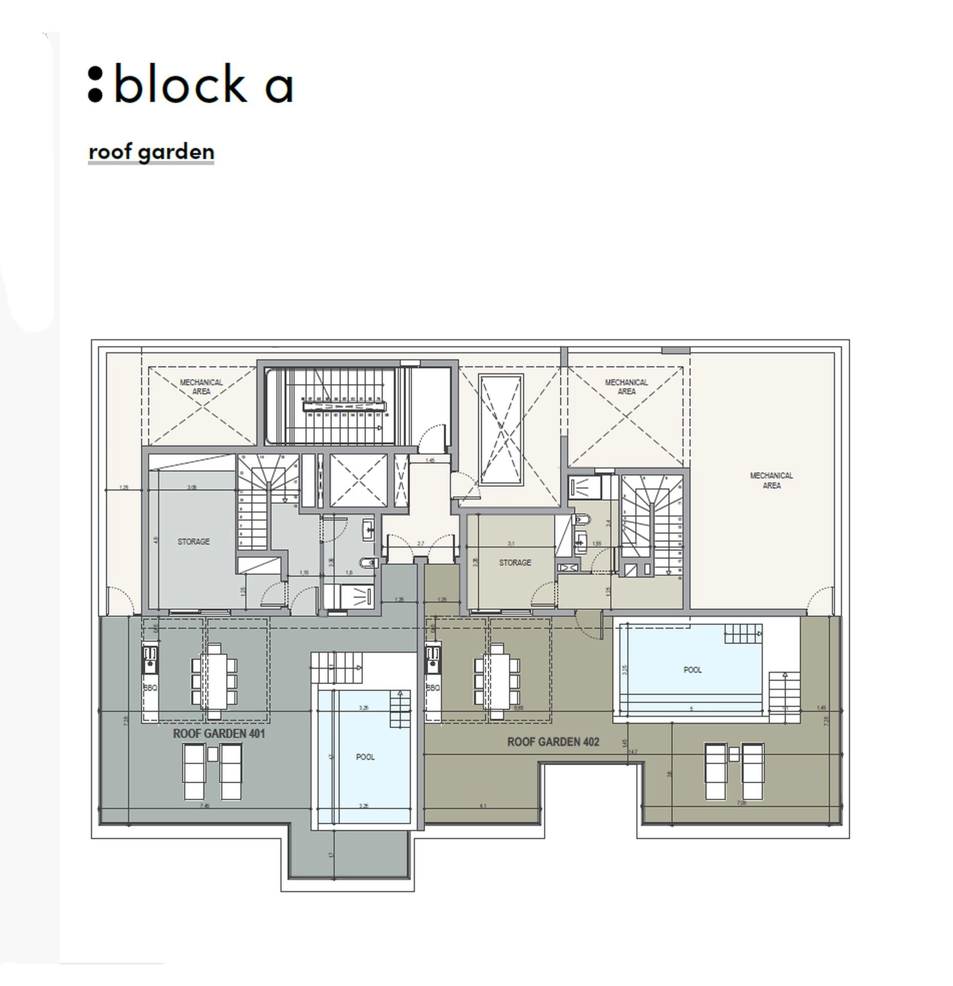 Three-bedroom penthouse 401, with an internal area of 128 m², an auxiliary area of 44.6 m², and a 95.6 m² roof garden with a private swimming pool, is located on the fourth floor of a four-storey building in Block A.