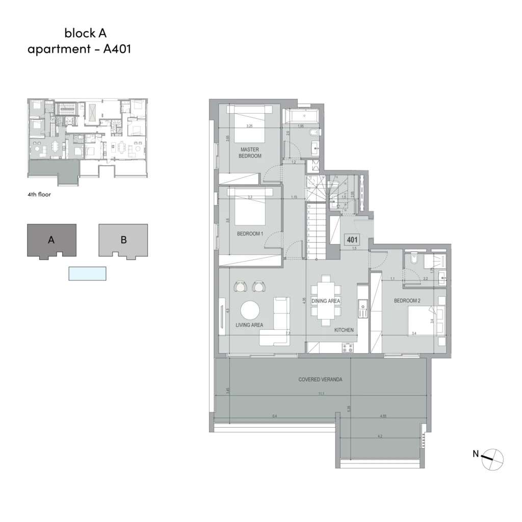 Three-bedroom penthouse 401, with an internal area of 128 m² and a 95.6 m² roof garden with a private swimming pool, is located on the fourth floor of a four-storey building in Block A.
