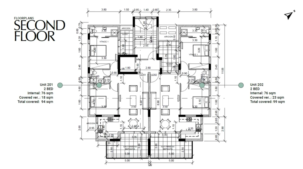 Two-bedroom apartment 202, with an internal area of 76 m², is located on the second floor of a four-storey building.