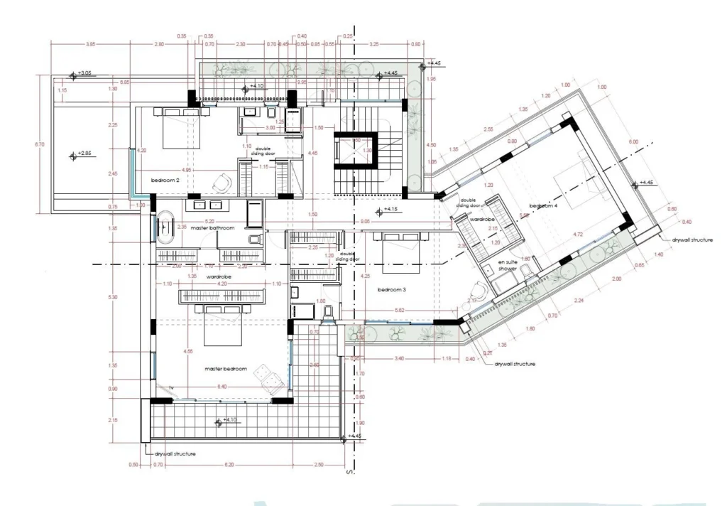 On the First floor, 316 m² – Master bedroom with en-suite and walk-in wardrobe, other 3 bedrooms with en-suite and walk-in wardrobe, Covered and uncovered verandas, Garden.