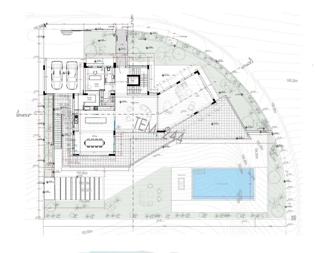 On the Ground floor, 681 m² – Office, TV room, Living room, Kitchen and dining area, Pantry, Walk-in wardrobe, Guest toilet, Server room, Elevator, Garage for 2 cars, Large covered veranda, Garden.