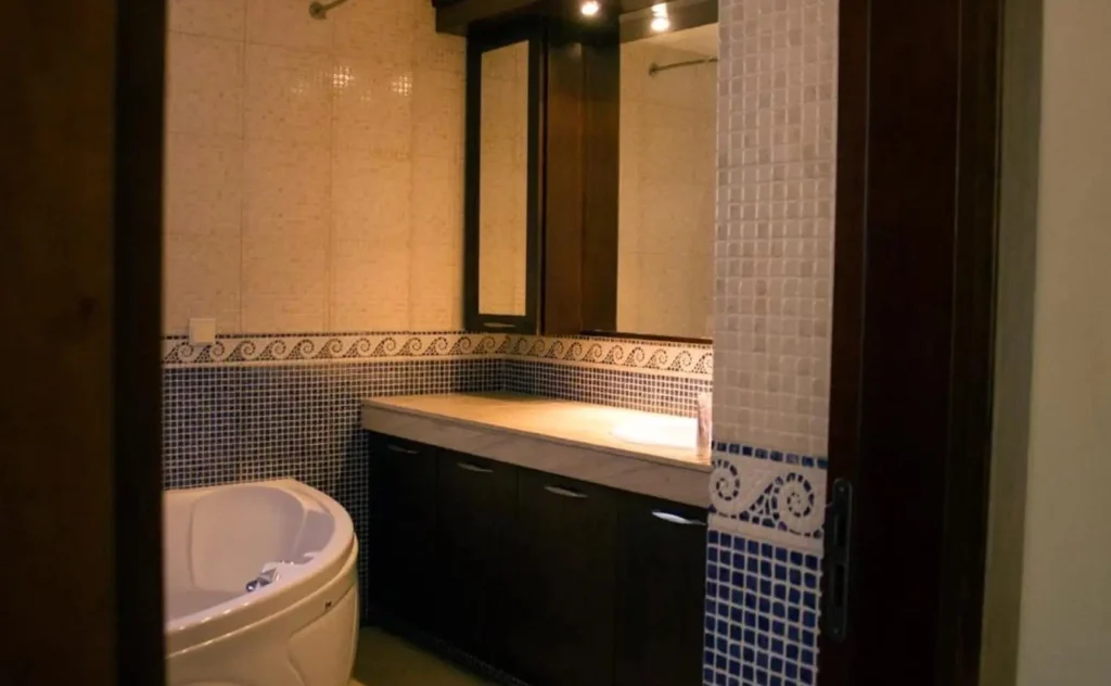 Elegant multi-level residence offering 4 bedrooms on the top floor (2 en-suite + 1 shared bathroom), plus a ground-floor playroom/bedroom with en-suite and a guest bathroom. Includes 2 kitchens, 2 living rooms (one with fireplace), and a separate maid’s room with en-suite.