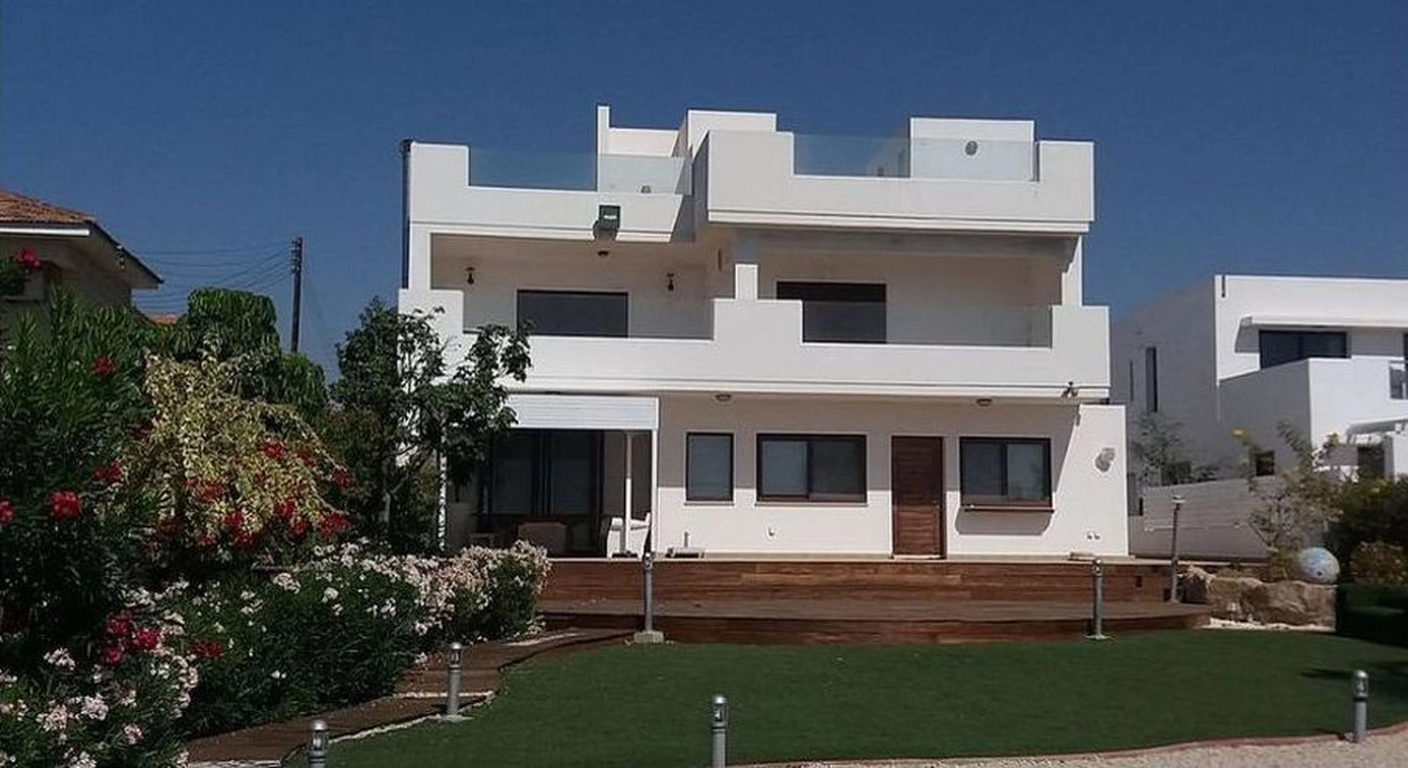 This luxury villa is located in Zygi village, 80 meters from the sea. Villa consists of 4 bedrooms, 5 bathrooms (some with steam bath). It has an open living room with the kitchen. From the villa open unobstructed sea views. The interior of the villa has a Moroccan style. There is a heated pool area with Jacuzzi, sauna. There is a roof garden with the view of all the surrounding area and the beach. In the basement there is a home cinema, play room, bedroom and 2 covered parking places. The villa has large verandas in the fully landscaped garden with stones, mosaics, sculptures. There is also a glass elevator in the villa for all the floors. The villa has a smart house system, solar storage system, floor heating units, air conditioning units, fire place. The villa is currently rented out until 01/06/2023.