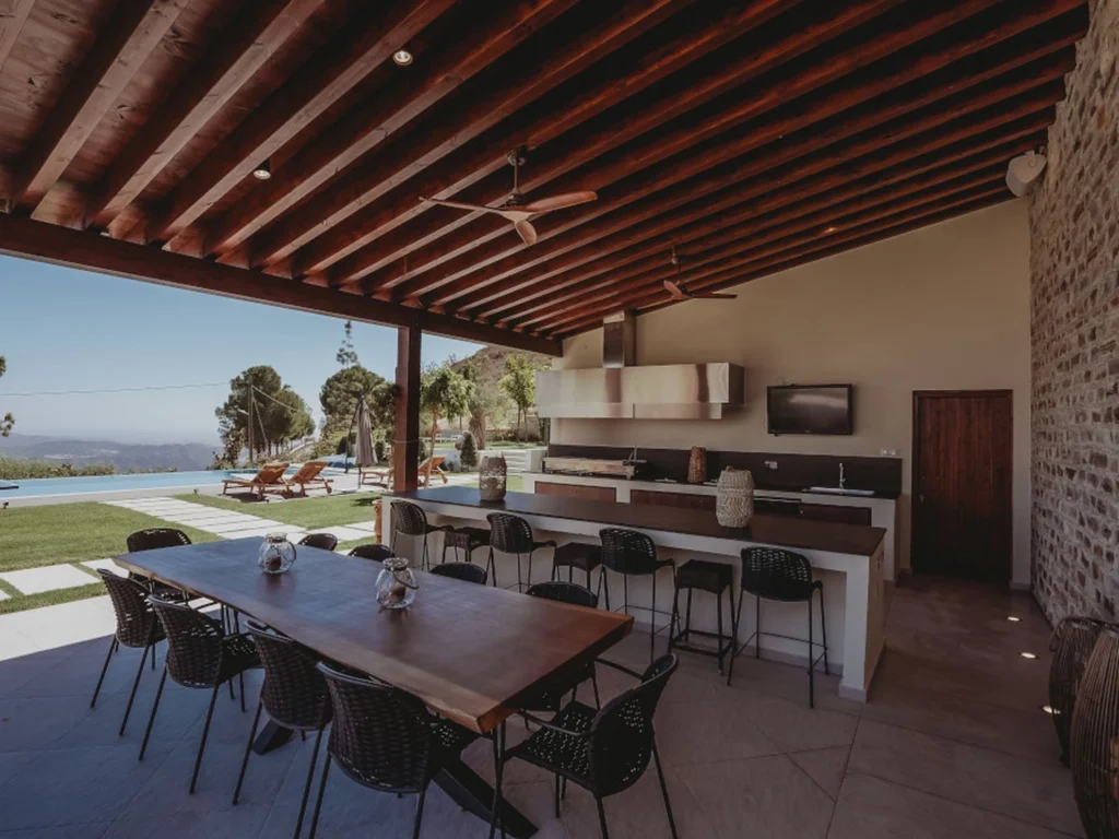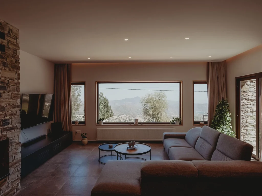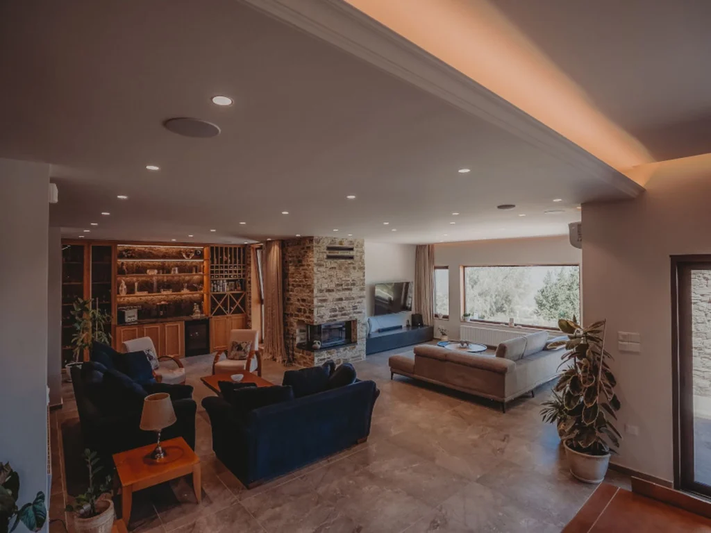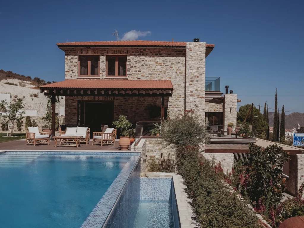 This villa is placed on top of a hill overlooking one of the nicest views of the island. It offers unobstructed views of the picturesque valley, the Mediterranean sea and the surroundings. This 9 bedroom villa is unique, as it manages to combine 6 large bedrooms in the main house, as well as 3 independent luxurious suites. This modern hotel like living space offers all the high-end amenities whilst combining an agricultural experience from its private mountains that produces Mediterranean fruits and olives. The 3 luxurious guest houses found within the premises, manage to combine absolute privacy for all your guests. All three units offer separate garden areas and are equipped with fire places, beautiful kitchens and dining areas, as well as modern bathrooms and jacuzzies. Main features: Private garage at villa level for 6 cars Full air-conditioning systems in all areas Fully integrated indoor and outdoor Sound System Large professional barbeque area Heated swimming pool 5 x fireplaces Smart audio, video, lighting, electric curtains Central heating system with own boiler room Service room on a separate level Segregated laundry area Gym and playroom (optional area possible). The Total land area is 7,164m2. Main house indoor area: 370 m2 Guest houses indoor area: 181 m2 Other dimensions: Garden area: 852 m2 Pool house covered area: 88 m2 Private parking area: 335 m Laundry room and services area: 62 m2 Guest Houses Private Porches: 130 m2 Guest Houses Parking Area: 120 m2 (equal to more than 6 parking spots). The Guest Units offer a lovely place to host several guests for long or short term stays. They can also be an income producing asset for the owner of the villa if they wish to do so (€8.000 per month from an Airbnb business in addition to the main villa).