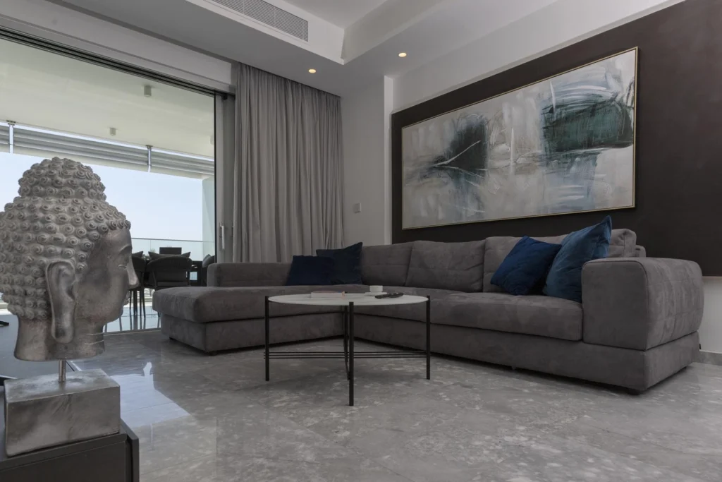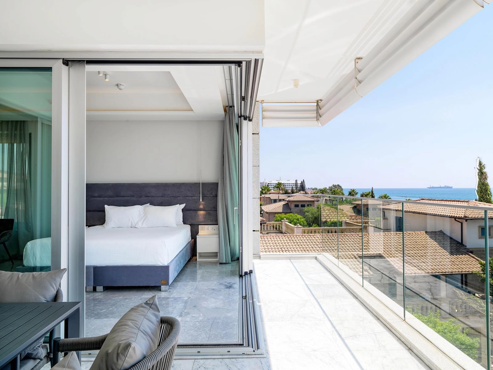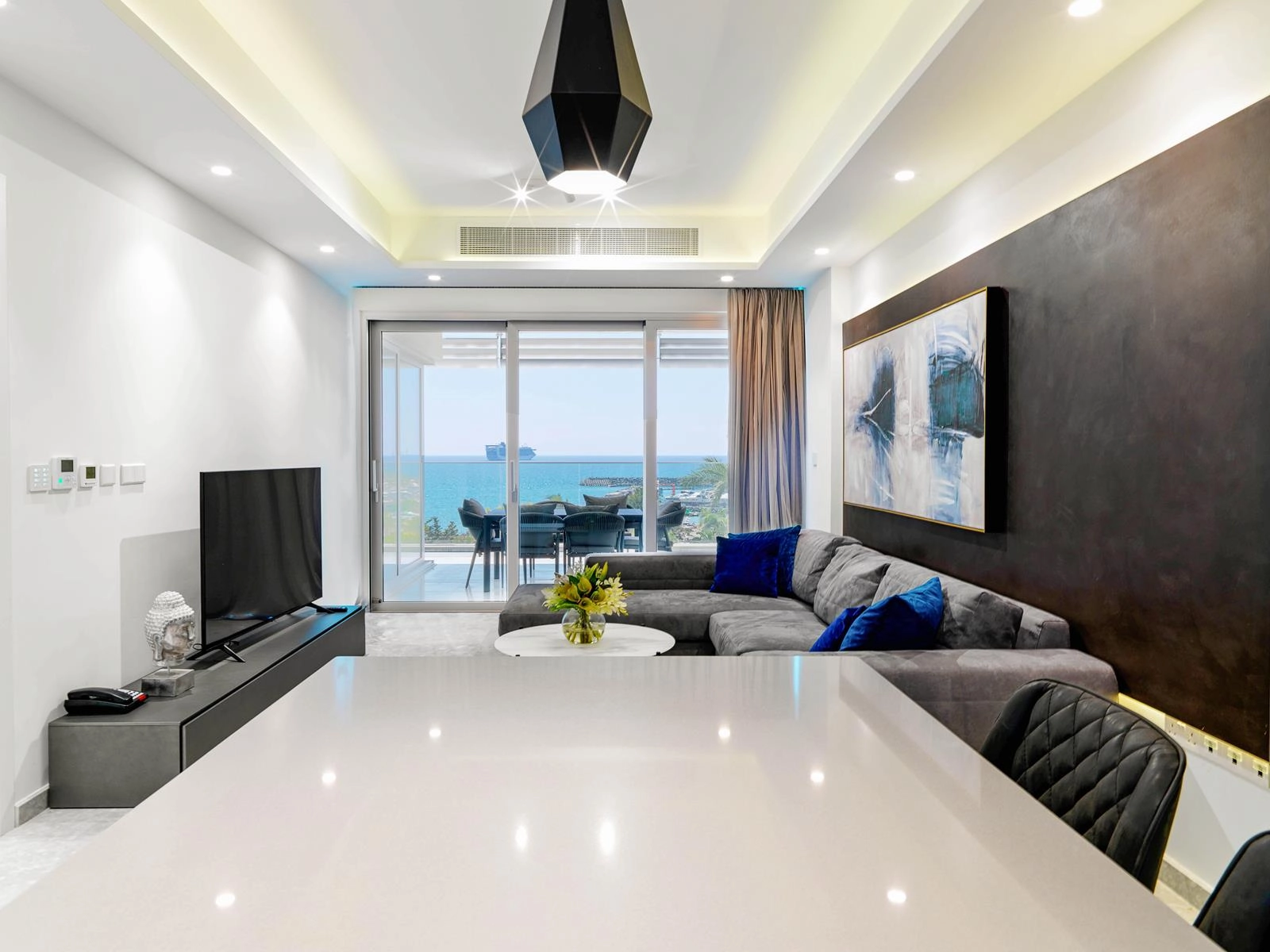 This luxurious apartment offers stunning views over the eastern part of Limassol’s Bay and to the south over the unique St Raphael Marina and private hotel gardens. The apartment boasts a beautiful covered veranda to enjoy at any time of the day. The stunning grey marble is complemented by an open-plan Italian kitchen, equipped with all your needs, and there is a large L-shaped sofa for ultimate movie nights. The exceptionally large master bedroom has a seating area and, most importantly, huge windows to enjoy the unrivaled views of the five-star resort’s pool area, gardens, and sea. There is a second comfortable double bedroom.The main features of the apartment: VRV air-conditioning Island bar for kitchen with 2 stools Underfloor heating Italian kitchens fully equipped with domestic appliances Smart home by Lutron Security front door with intercom 24/7 concierge/reception/security 2 toilets One ensuite bathroom with bathtub One shower for the second bedroom Fitted wardrobes and cupboards 65-inch smart TVs Villeroy and Boch sanitary ware Grohe mixers Bosch domestic appliances 3-meter clear ceiling height Access to hotel underground parking