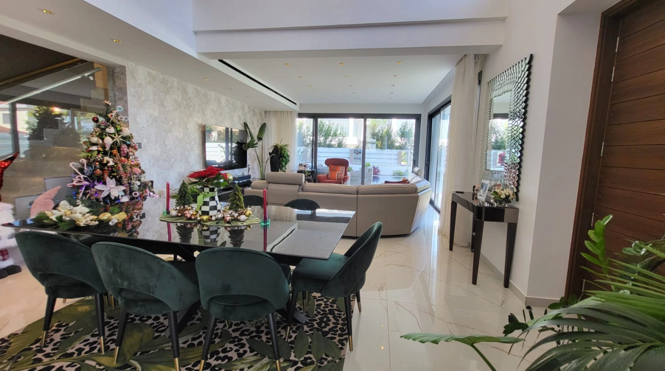 This fully furnished 5-bedroom villa is located in the Dekelia area of Larnaca, just 450 meters from the sea. The property offers a spacious covered area of 265 sq.m. on a 564 sq.m. plot. It includes a private heated infinity pool with salt water, a roof garden, and a dedicated barbecue area. The villa is equipped with smart home features, including climate control, underfloor heating, video surveillance, and advanced security systems. The interior features a high-end kitchen with Miele appliances, multi-level lighting, luxury furniture, and an Italian rock crystal chandelier. Each bedroom has a veranda and built-in wardrobes, while the master suite includes a large en-suite bathroom and a walk-in closet. The villa also has an office, a separate maid’s room, and additional storage spaces. Safety elements such as non-slip stairs, security sensors on every window, and protective laser fencing are integrated throughout the property. The main features of the project and the units: Distance to the sea: 450 meters Private heated infinity pool with salt water Roof garden, barbecue area, high-quality outdoor shower Fully furnished, all electrical appliances included Smart home features: underfloor heating, climate control, smart lighting Security: video surveillance, intercom, laser perimeter protection High-end kitchen with Miele appliances, two ovens Luxury interior: Italian wallpaper, rock crystal chandelier, multi-level lighting Office, maid’s room, additional storage spaces Solar panels for water heating Provision for a rooftop jacuzzi and barbecue No VAT, resale The project has an EPC certificate with “B” energy efficiency rating.