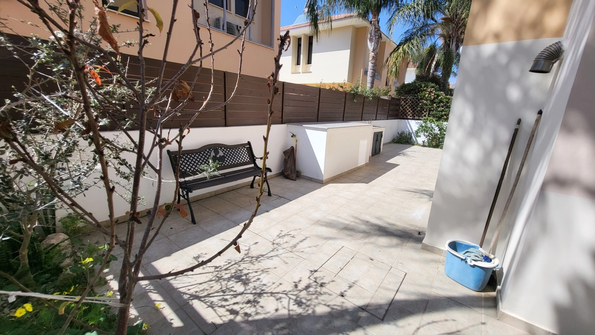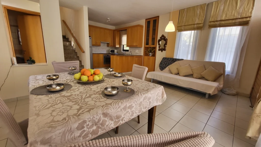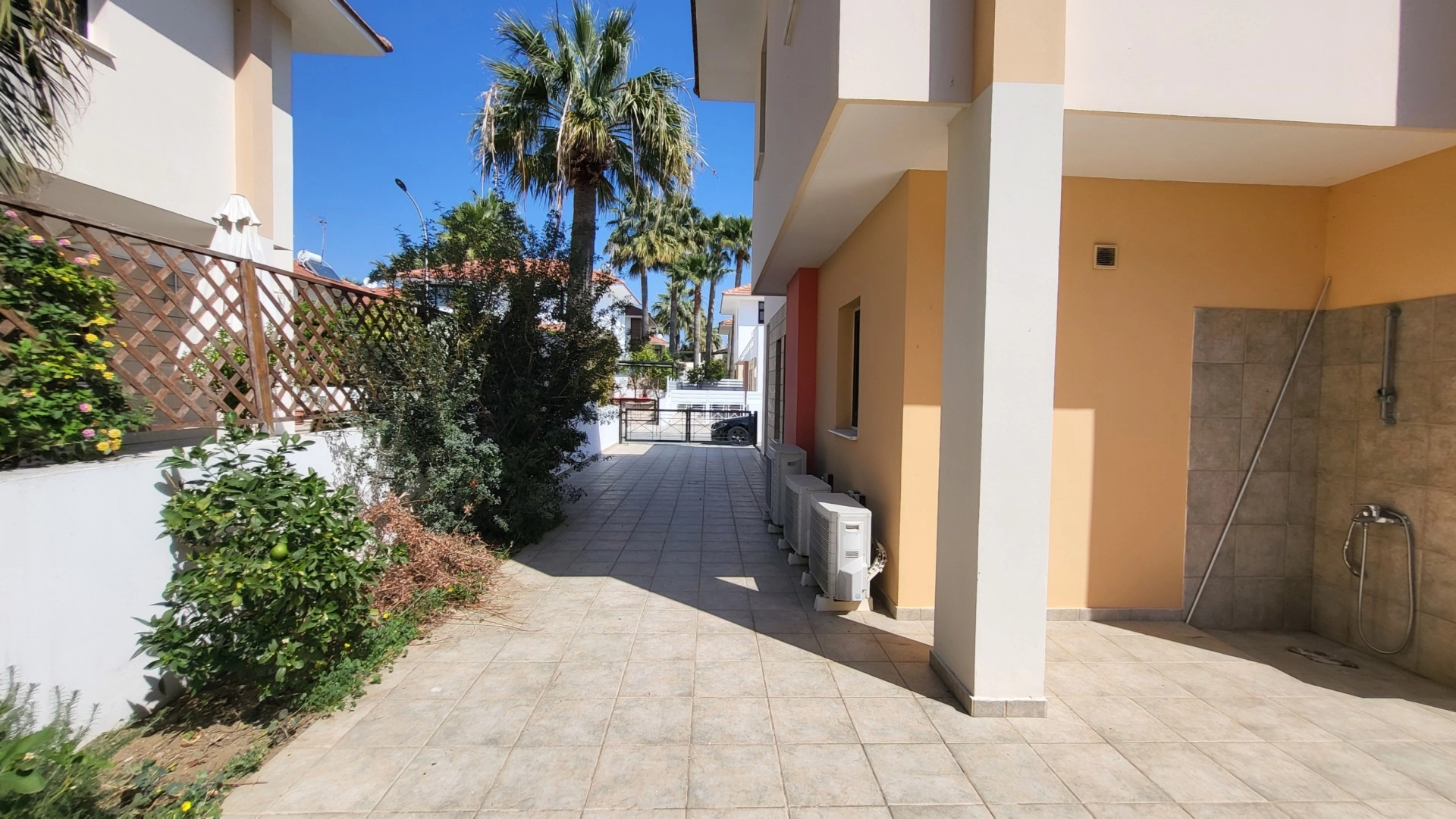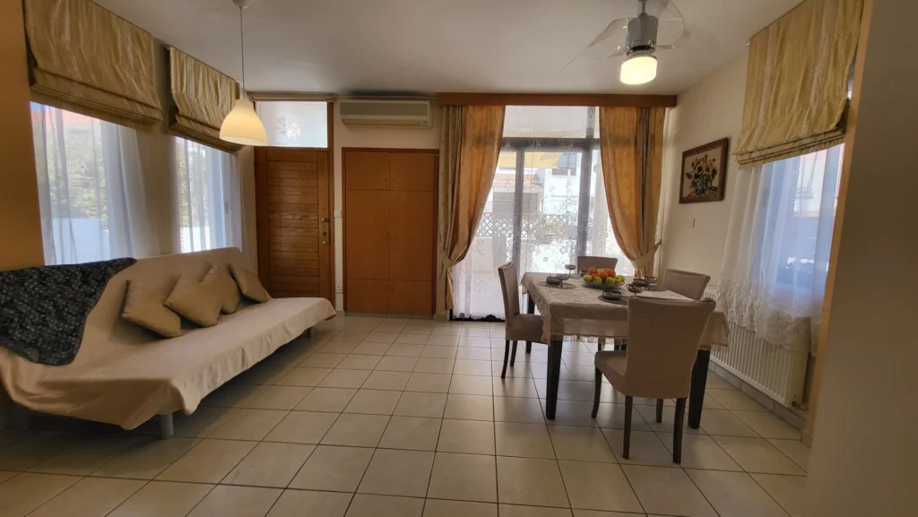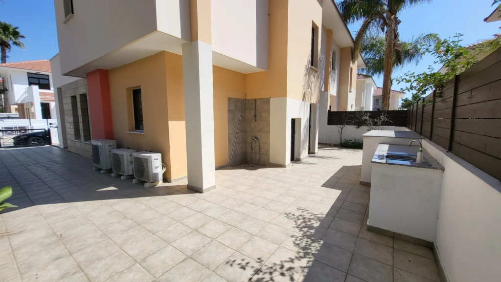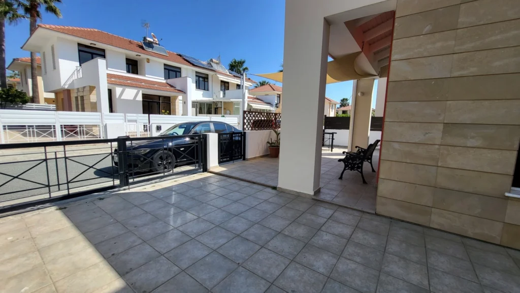 This 2-bedroom villa is located in the Dhekelia Road area, the main tourist zone of Larnaca, within walking distance of numerous restaurants, bars, and clubs. Situated just 150 meters from the sea, the property is part of a gated complex. The property offers approximately 120 sq.m. of living space on a 250 sq.m. plot. It features two bathrooms, an outdoor shower, and an automatic retractable awning on the veranda. The villa has autonomous heating (oil-based) and a barbecue area in the backyard. Available for both sale and rent. The main features: 2 bedrooms 2 bathrooms Outdoor shower Approx. 120 sq.m. covered area Approx. 250 sq.m. plot 150 meters from the sea Autonomous heating (oil) Automatic retractable awning on the veranda Barbecue area in the backyard Gated complex No VAT, resale Available for rent at €1,700 per month (+1 deposit). The project has an EPC certificate with “B” energy efficiency rating.