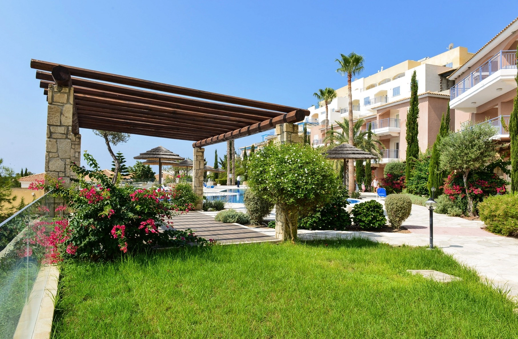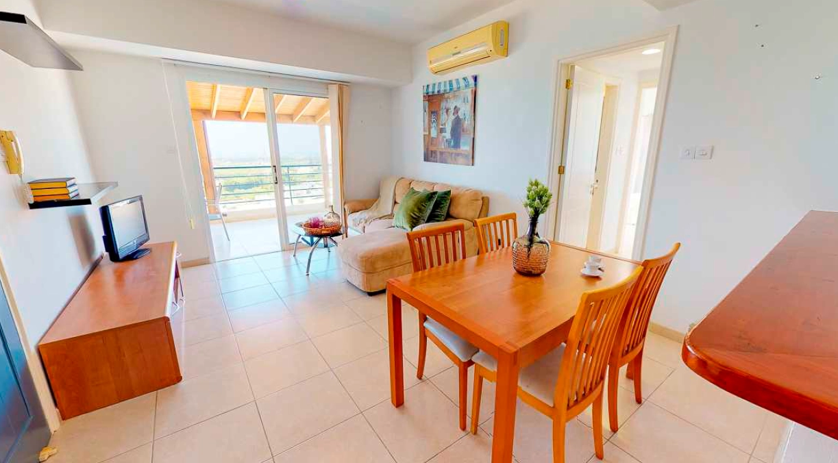 This fully furnished apartment is located in Geroskipou, on the outskirts of Paphos, offering convenient access to key services, schools, healthcare facilities, and golf courses. The international airport is just a short drive away, making it suitable for both permanent living and holiday use. The property features an open-plan living and dining area, a separate kitchen, two bedrooms, and one bathroom. The layout extends outdoors with a covered veranda, a large uncovered veranda, and a private roof terrace measuring 151 m². The apartment includes allocated parking and access to communal areas within the development. Residents can enjoy large shared swimming pools, a restaurant, bar, and a mini market located within the complex. Air conditioning units are installed in all rooms. The main features of the project and the units: Location: Geroskipou, Paphos Open-plan living and dining room Separate kitchen 2 bedrooms, 1 bathroom Covered internal area: 84.20 m² Covered veranda: 7.50 m² Uncovered veranda: 42.55 m² Roof terrace: 151.00 m² Total covered area: 91.70 m² Allocated parking Large communal swimming pools Restaurant, bar, and mini market on-site Fully furnished Air conditioning in all rooms Easy access to amenities, schools, medical centers, golf courses, and airport The project has an EPC certificate with “B” energy efficiency rating.