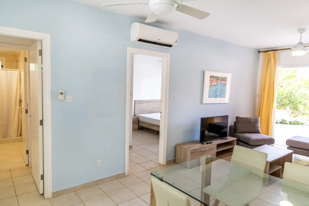 This ground floor apartment is part of a seafront residential development offering a selection of one- and two-bedroom apartments, penthouses, and detached villas. The property is designed with practicality in mind and is suitable for permanent residence, holiday use, or investment purposes. The apartment includes a living room, dining area, kitchen, two bedrooms (one with an en-suite bathroom), and a second bathroom. A covered veranda provides outdoor seating space, and the apartment also benefits from a private landscaped garden and allocated parking. Residents have access to communal facilities including two shared swimming pools, one of which is heated during the winter. The development also features a private clubhouse reserved for residents. The finishes throughout the property reflect traditional local architectural elements and materials. The location provides convenient access to golf resorts, amenities, services, and is well-positioned between Paphos and Limassol. The main features of the project and the unit: Ground floor apartment Living room Dining room Kitchen 2 bedrooms (1 en-suite) 2 bathrooms Covered veranda Landscaped garden Private allocated parking Two communal swimming pools (one heated) Clubhouse for residents Air conditioning Underfloor heating (where applicable) Safe and quiet location The project has an EPC certificate with “B” energy efficiency rating.