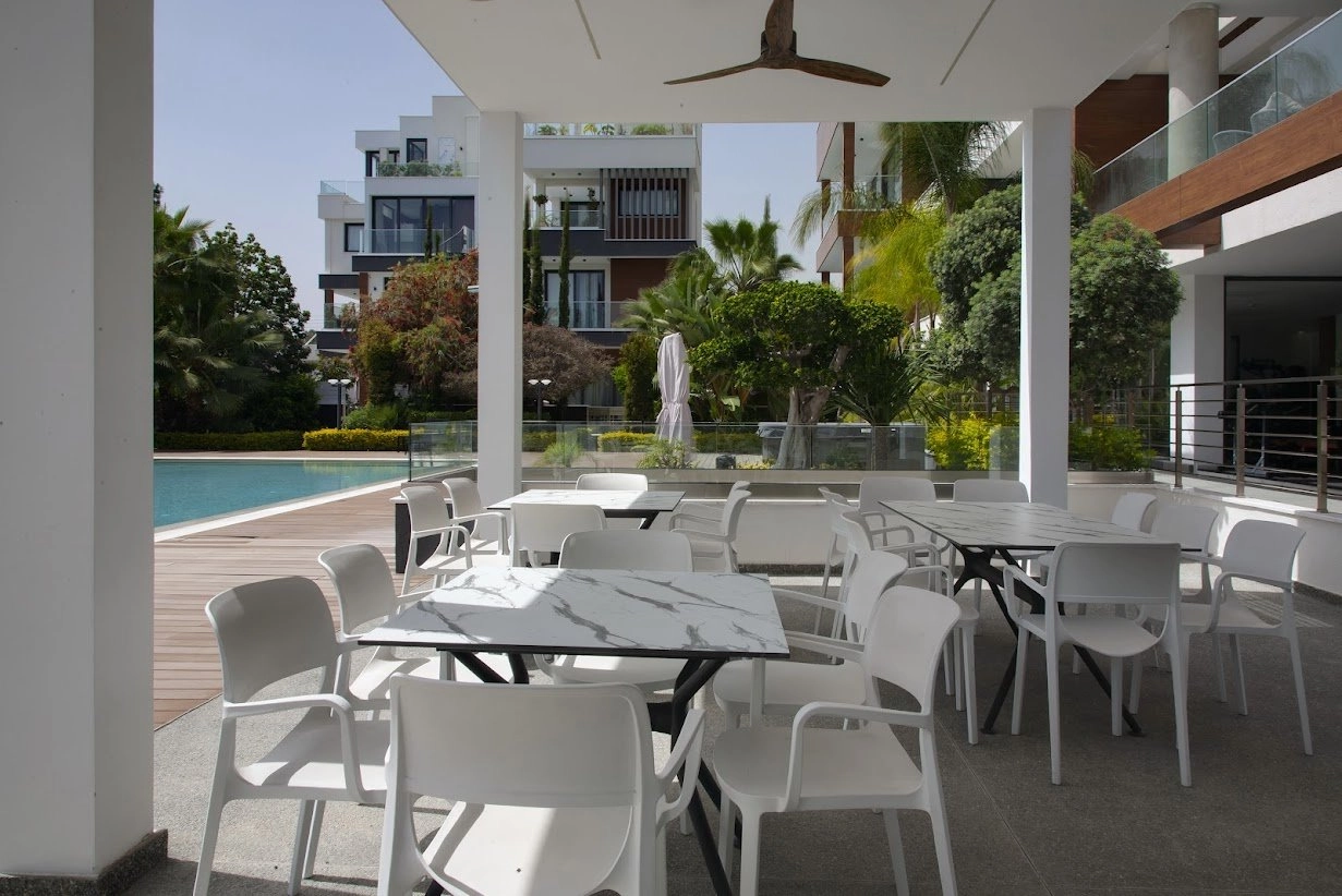 This modern 2-bedroom apartment is located in the sought-after area of Potamos Germasogeias, Limassol, within a secure gated complex with premium amenities.