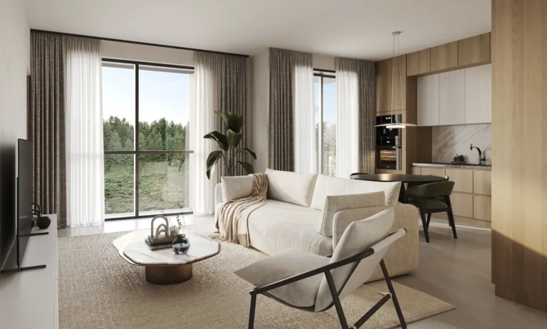 The two-bedroom apartment is an excellent choice for small families or those who appreciate extra space. The living and dining area is spacious and filled with natural light, opening to a wide balcony that extends the home outdoors. The kitchen blends elegance with functionality, offering granite worktops, premium cabinetry, and space for family cooking.