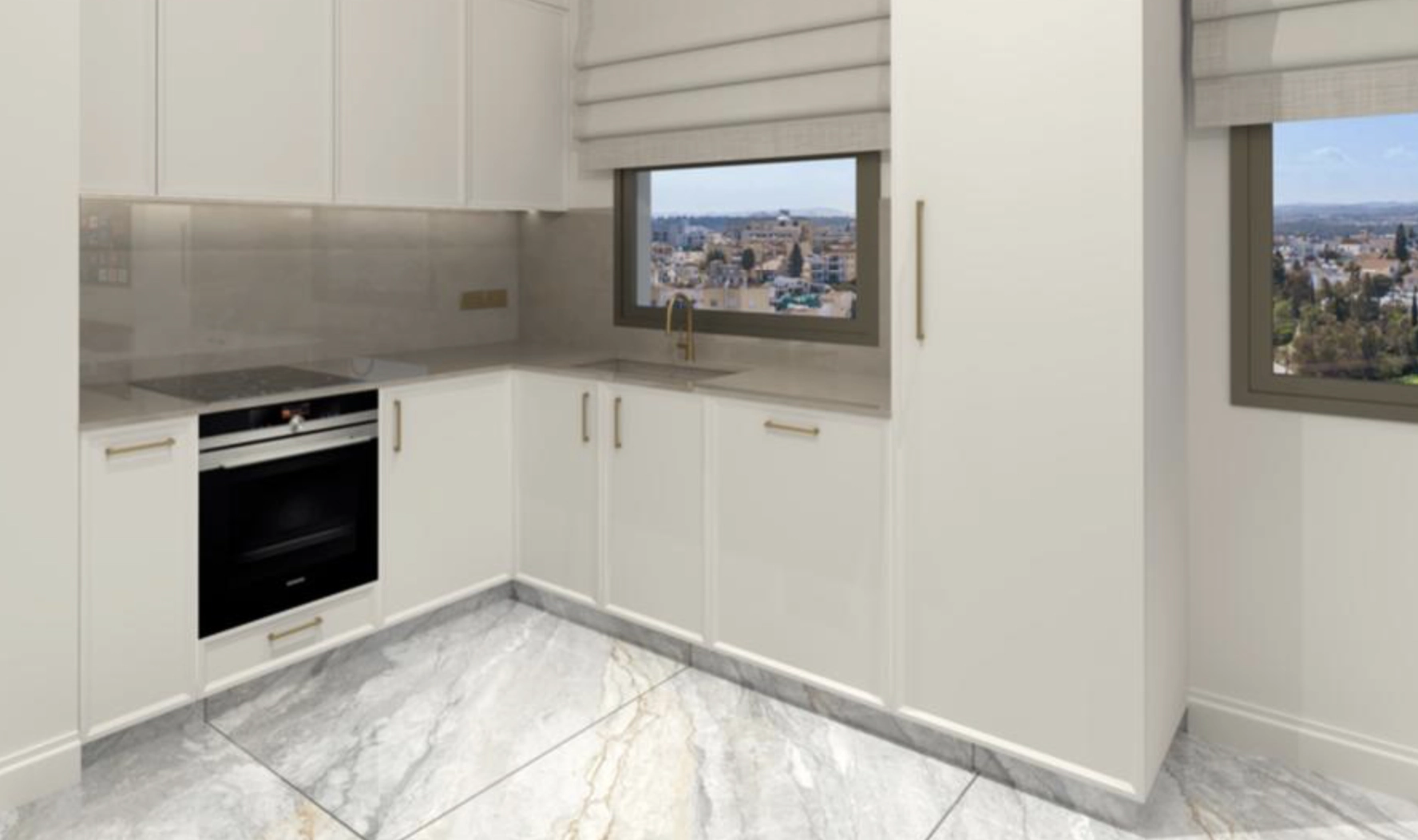 The living and dining area is expansive, with sliding doors opening onto a large veranda — perfect for entertaining or enjoying Mediterranean evenings outdoors. The kitchen offers premium cabinetry, generous storage, and a sleek design that connects seamlessly with the living space.