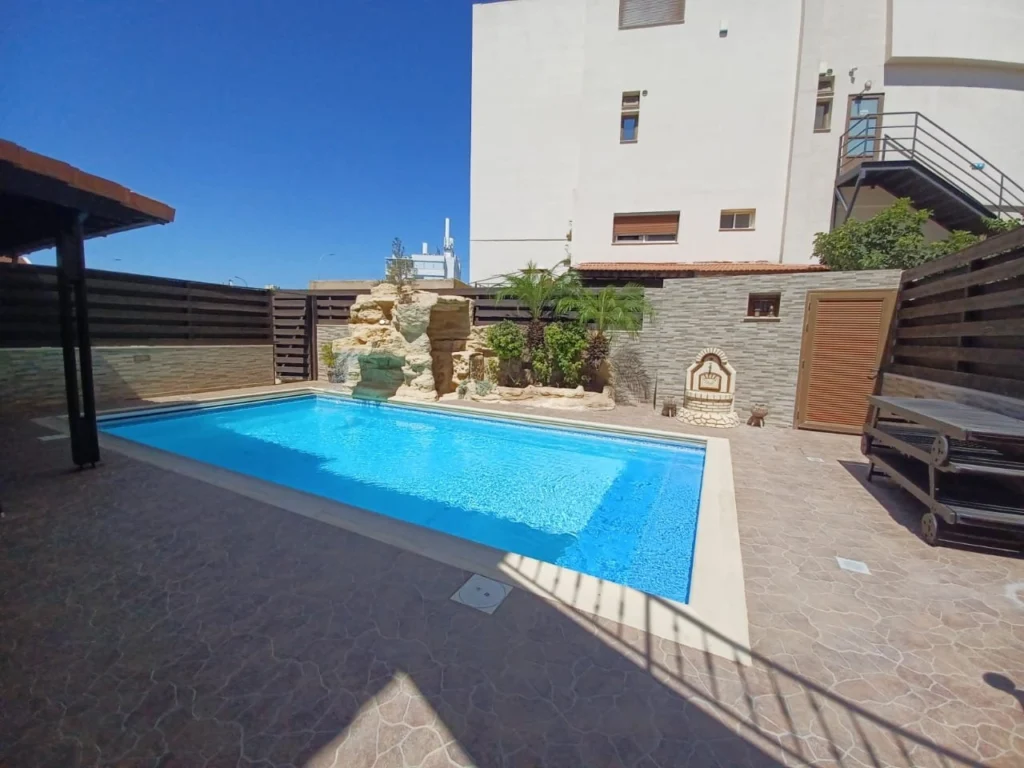 The outdoor area includes a private swimming pool, fountain, BBQ area, shower and toilet, garage, and utility room. The house is in excellent condition.