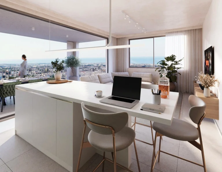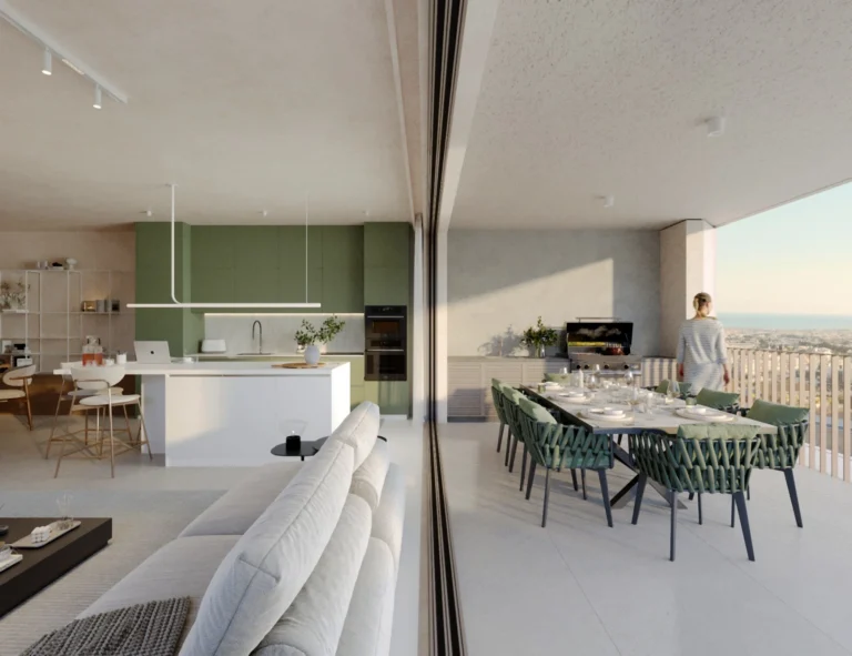 The living and dining area is expansive, filled with natural light from floor-to-ceiling windows, and opening directly onto a wide private veranda. This seamless transition between indoor and outdoor living creates the perfect environment for family gatherings, entertaining guests, or quiet evenings overlooking the city and sea.