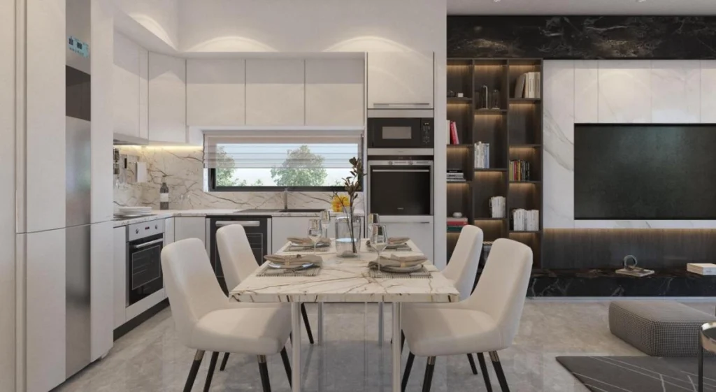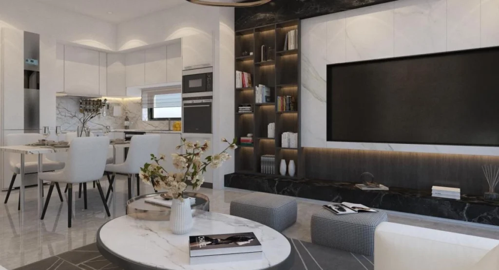 For sale a modern apartment in a residential complex under construction in the Livadia area, Larnaca, ideal for a comfortable life or investment. The apartment includes a spacious living room, kitchen and terrace, and has high-quality finishes with ceramic tiles on the floor. A smart home system and a video intercom are installed. The complex is equipped with electric vehicle charging equipment and a photovoltaic system. The construction uses the highest quality materials with the use of thermal insulation technologies. The design is made in a modern and stylish format. Parking and a storage room are provided on site. The convenient location ensures proximity to all urban infrastructures.