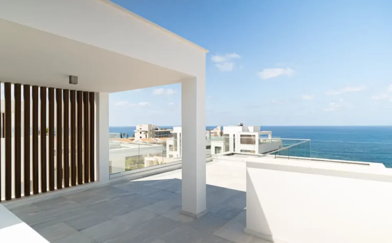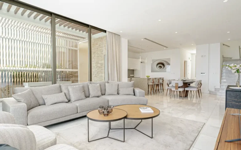 Each villa offers spacious interiors with large windows that invite natural light and frame the sea views. The design emphasizes open-plan living, creating a seamless flow between indoor and outdoor spaces. Private swimming pools, landscaped gardens, and generous terraces provide the perfect setting for relaxation or entertaining under the Cypriot sun.