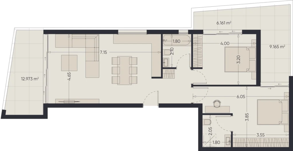 The project offers a variety of formats — from compact one-bedroom apartments starting at 67 m², ideal for rental, to a premium three-bedroom penthouse of 177 m², perfect for comfortable living or long-term investment