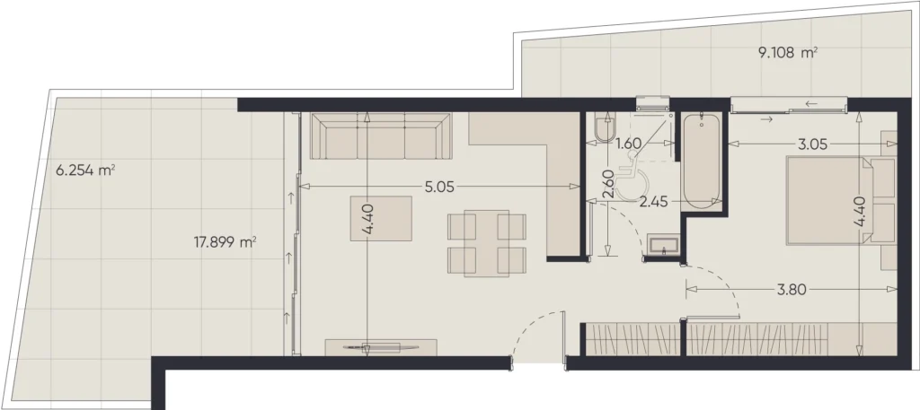 The project offers a variety of formats — from compact one-bedroom apartments starting at 67 m², ideal for rental, to a premium three-bedroom penthouse of 177 m², perfect for comfortable living or long-term investment