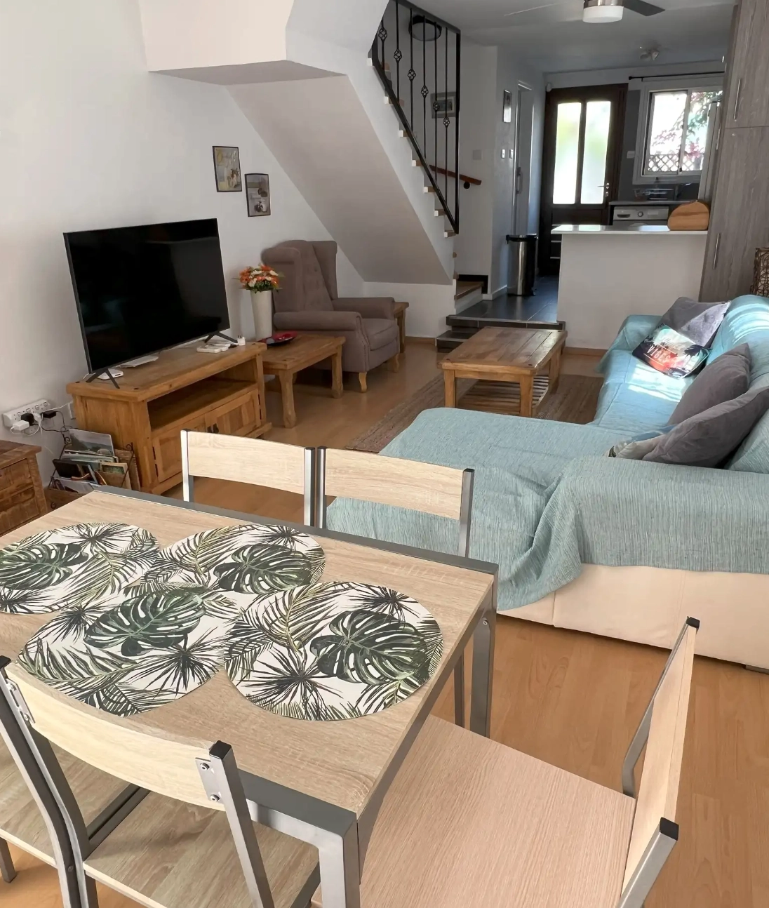 The ground floor features a spacious open-plan living and dining area connected to a fully equipped kitchen. A guest WC with shower is also located on this level, along with direct access to a private backyard—ideal for outdoor dining or relaxation.