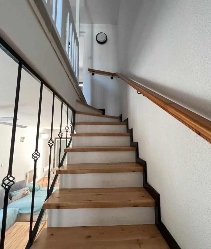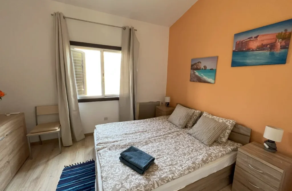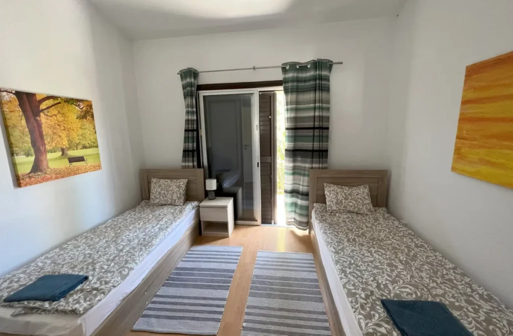 Upstairs, the maisonette includes two bedrooms and a second bathroom with shower. The master bedroom provides comfort and privacy, while the second bedroom opens onto a balcony with pleasant views.