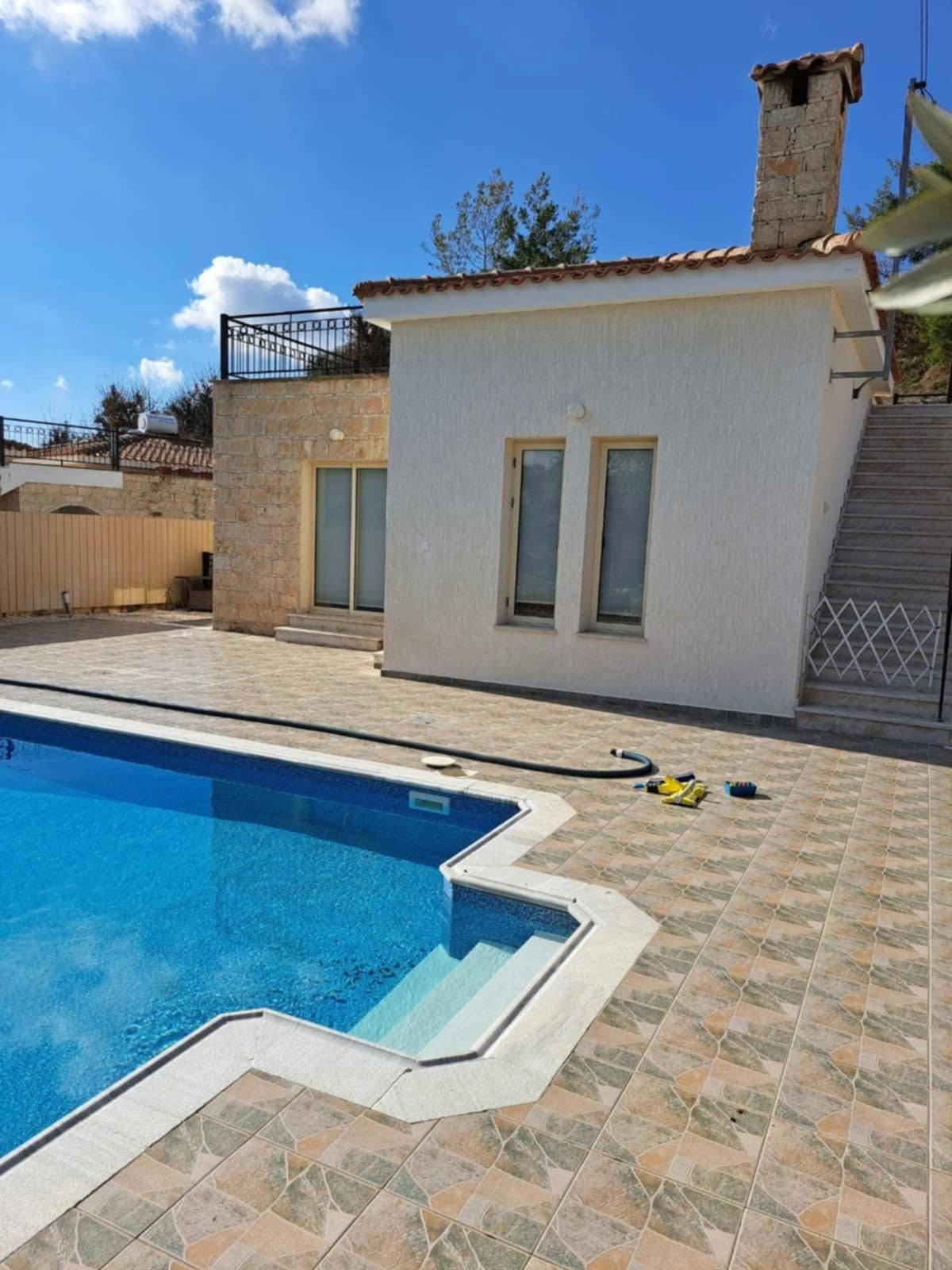 This bungalow is set on a spacious 820m² plot and offers everything needed for comfortable living. The property features a private 4x8m swimming pool, full central heating, and air conditioning. It is equipped with a pressurized water system and double-glazed windows, while a marble staircase leads to a charming roof garden, perfect for enjoying scenic views. Conveniently located, it is just a 15-minute drive to Limassol and 35 minutes to Paphos. Title deeds are available, ensuring a secure and seamless purchase.