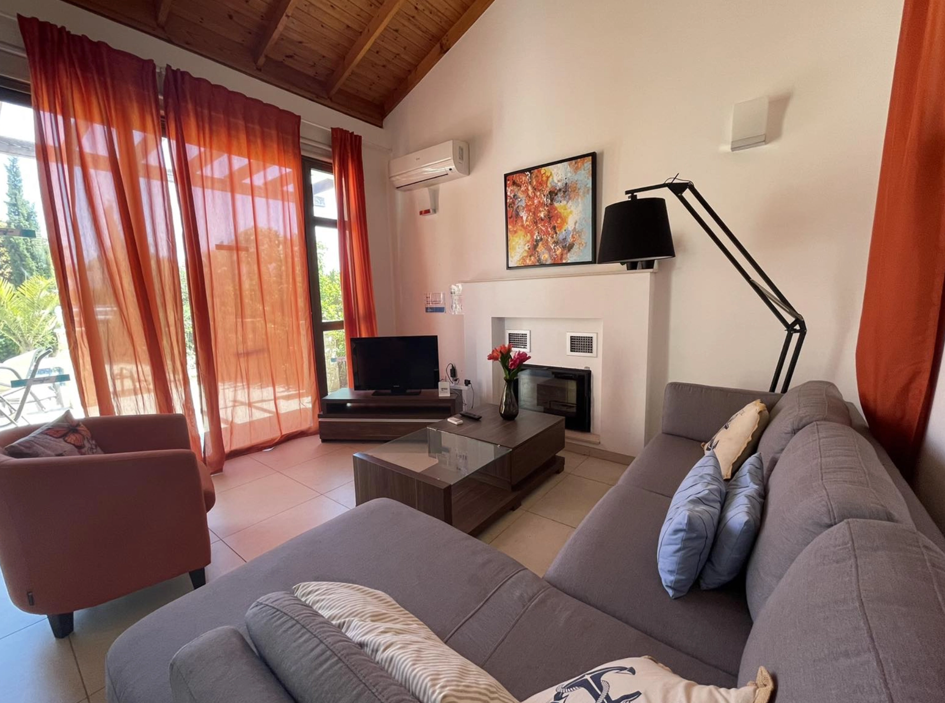 The villa features a bright open-plan living and dining area, seamlessly connected to a modern kitchen. Large windows invite natural light throughout the space, while a cozy fireplace adds warmth and character.