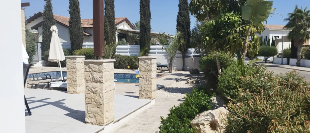 Designed for relaxation and entertainment, the villa’s outdoor spaces include a private swimming pool surrounded by a sunny patio—perfect for sunbathing, dining al fresco, or hosting family gatherings. The Mediterranean lifestyle is at your doorstep, whether you’re enjoying a refreshing swim or simply unwinding under the Cyprus sun.