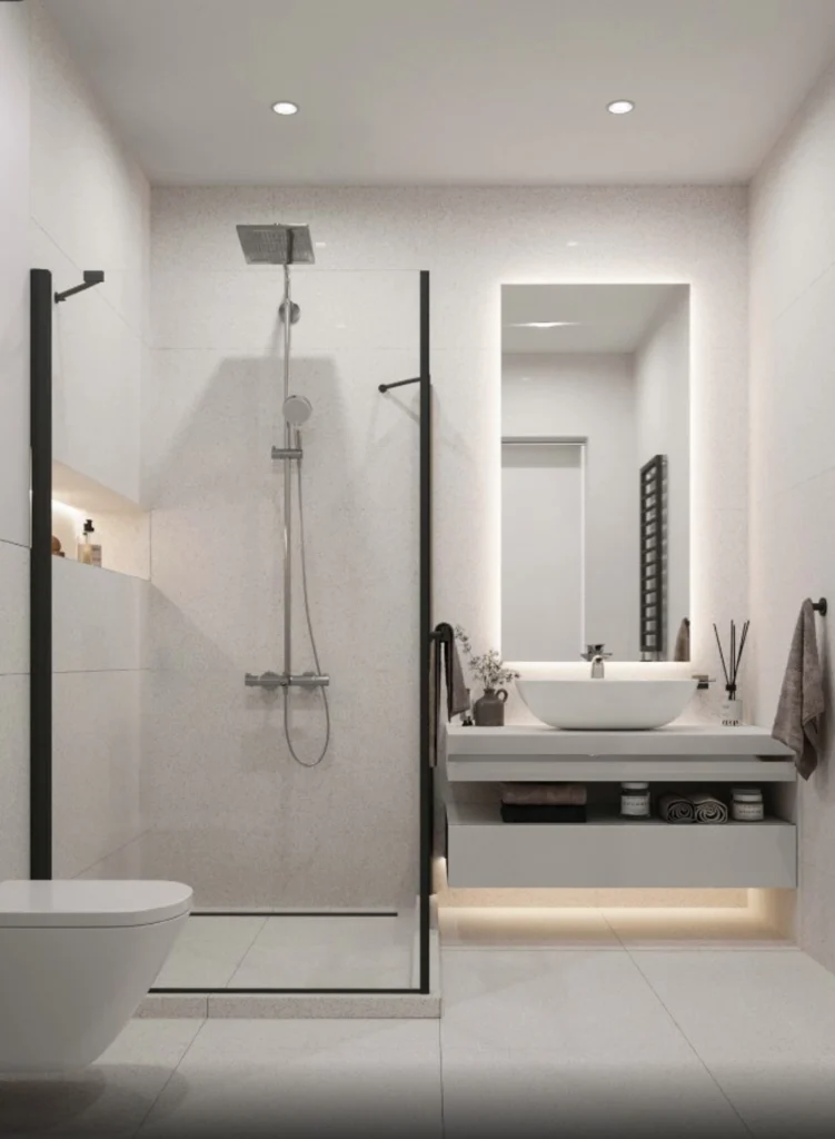 Alongside the en-suite, a family bathroom serves the apartment. Both are styled with elegant tiling, high-quality fixtures, and modern detailing, providing functionality with sophistication.