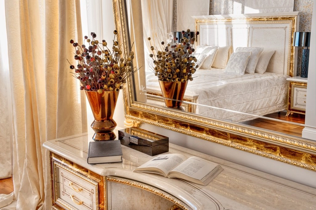 The neoclassical residence is finished in elegant beige tones with premium materials: Italian marble and parquet, Versace mosaic décor, Villeroy & Boch sanitary ware, and a designer Italian kitchen with Corian countertops.