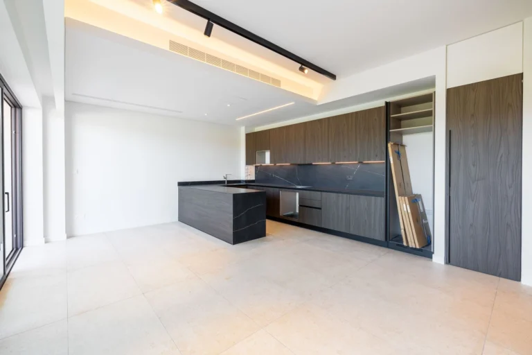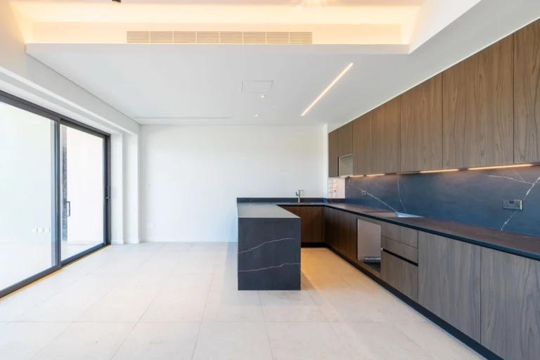 The apartment opens into a bright open-plan living and dining area, with floor-to-ceiling windows that maximize natural light and frame city or sea views. Sliding glass doors extend the interiors to a spacious veranda, creating an airy environment for both relaxed evenings and stylish entertaining.