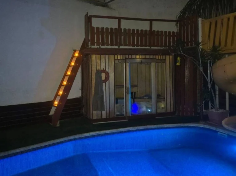The outdoor area provides everything for relaxation and entertainment: a large veranda with sea views, swimming pool with slide, outside sauna, gym, BBQ area, and a separate guest house with jacuzzi and bathroom.