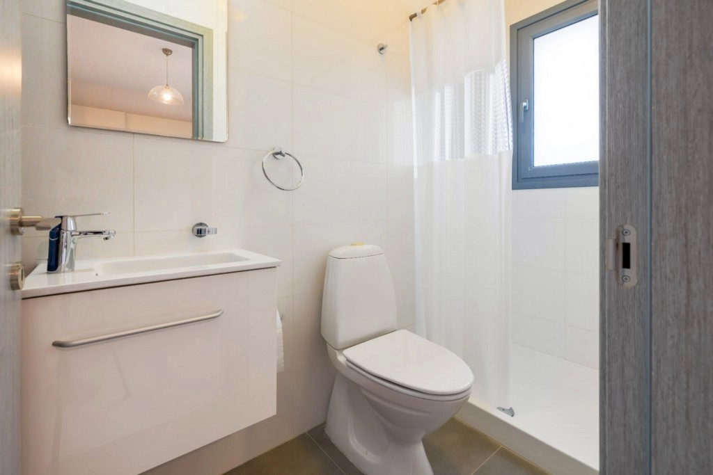 The apartment features a bright and spacious living room with an open-plan kitchen, fully fitted with modern electrical appliances, including a washing machine. There are three well-proportioned bedrooms, one of which is the master with its own en-suite shower. A family bathroom and an additional guest WC complete the layout. A large covered veranda extends the living space outdoors, offering an ideal spot for relaxation.