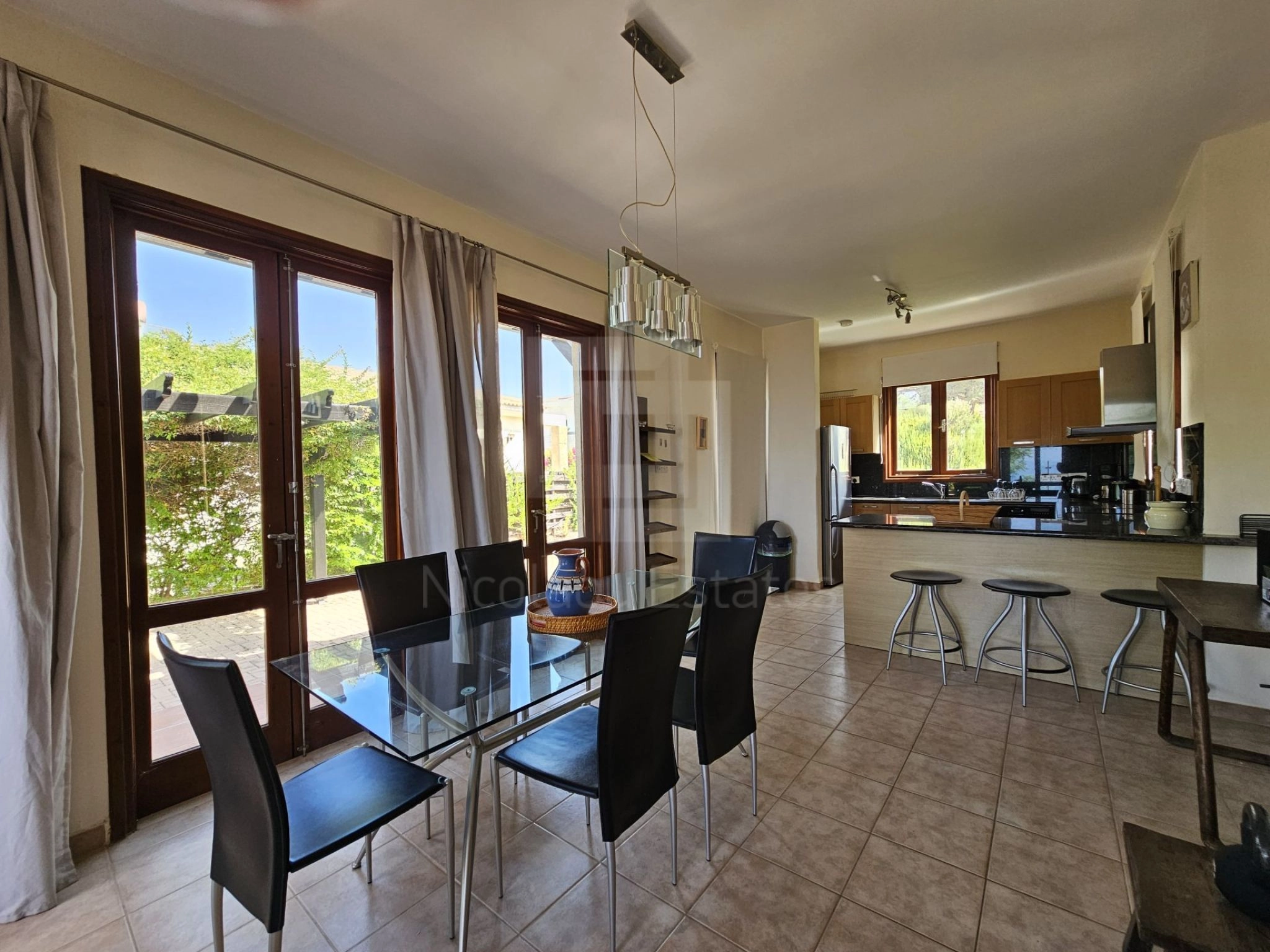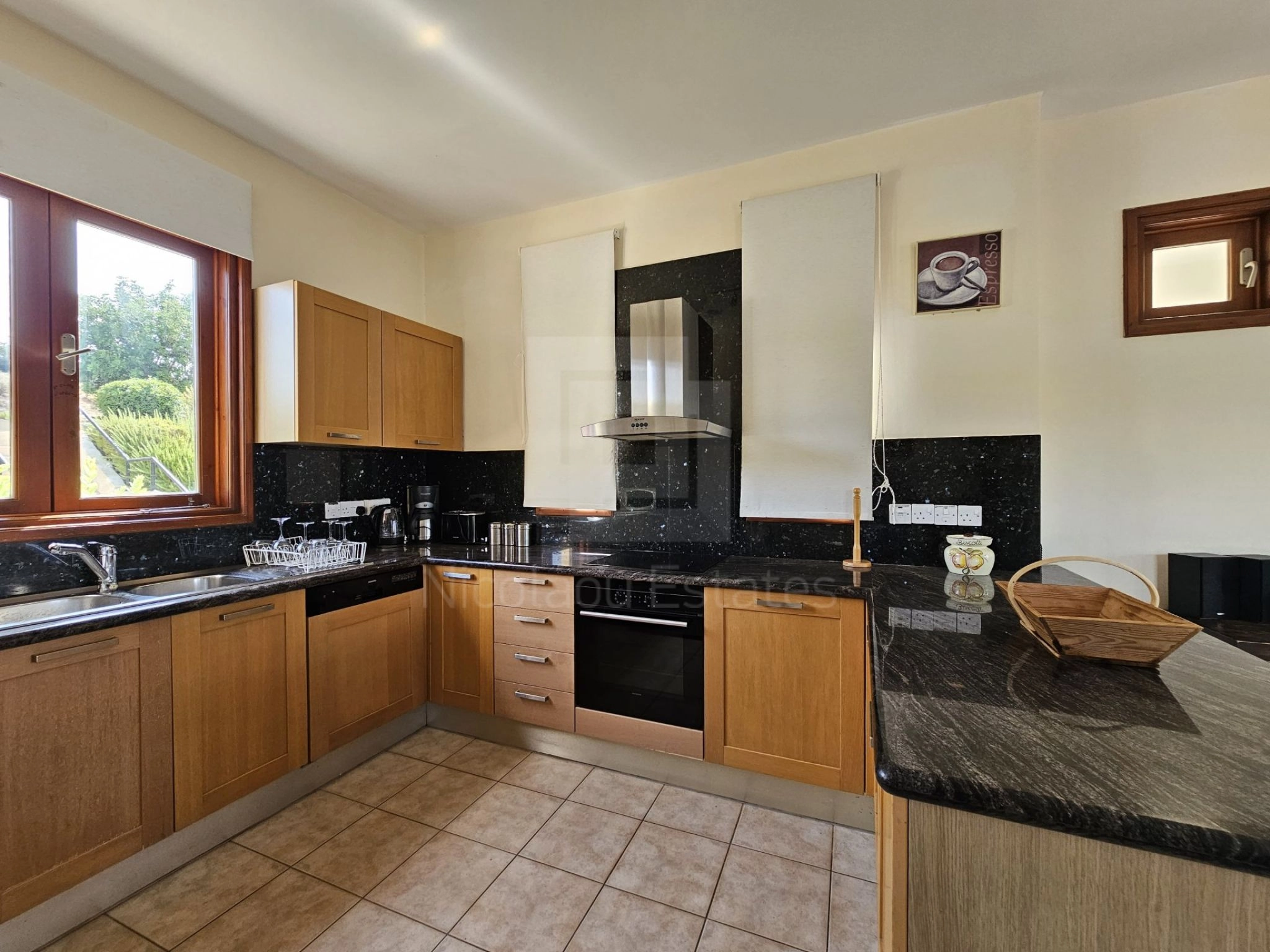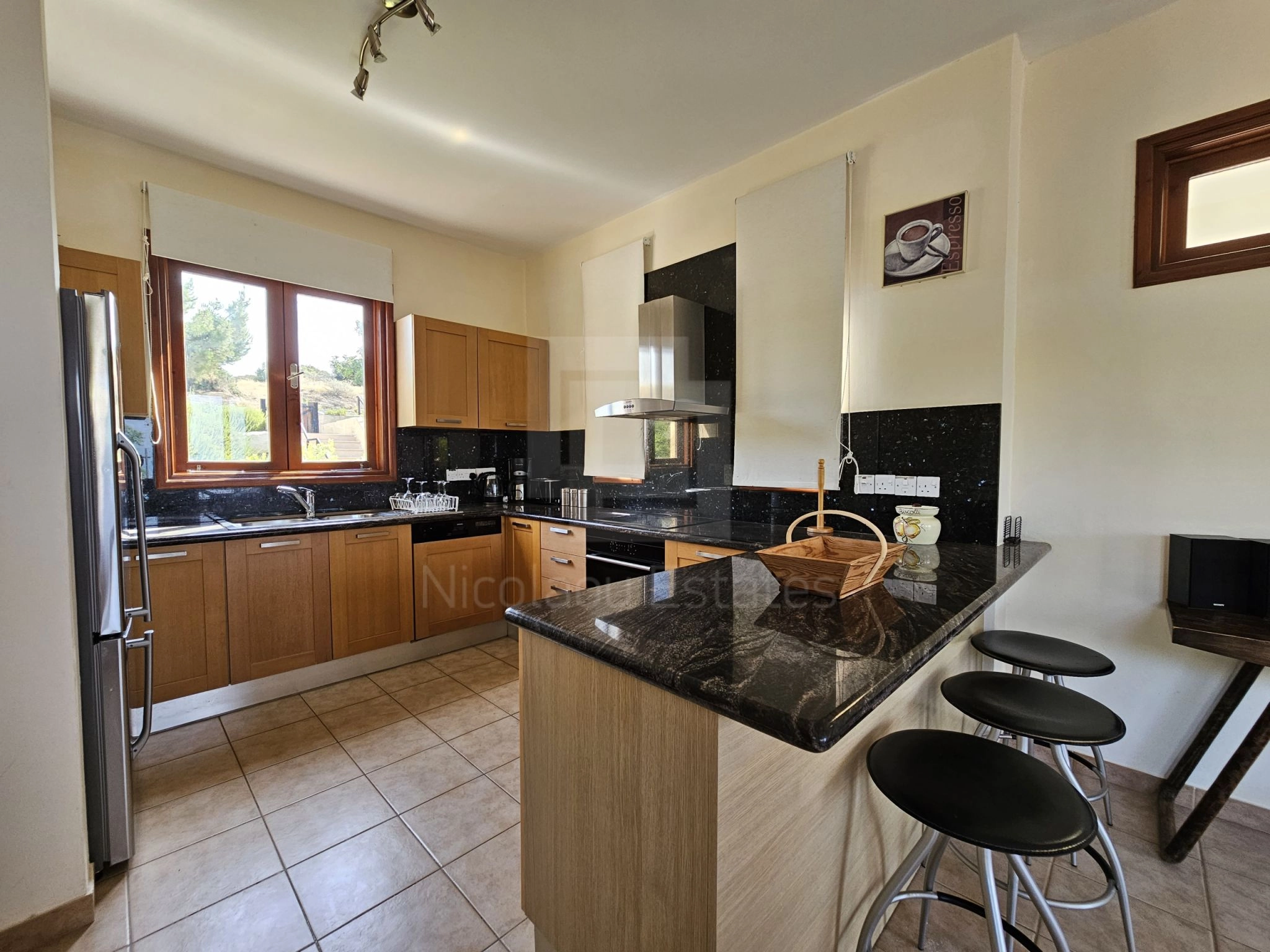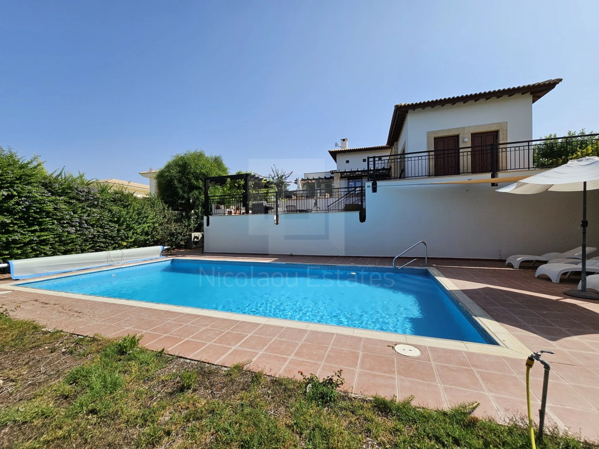 This fantastic villa is located on the highest point of the Eastern Plateau in the Award Winning Aphrodite Hills Resort offering fantastic views towards the blue Mediterranean Sea and PGA Golf Course. This fantastic villa offers complete privacy and is positioned in a prestigious and tranquil location immune from the noise of the distant highway. Upon entering this Villa one will notice the extremely high ceilings open plan living dining and kitchen areas. The Villa is harmonious in color and enjoys tremendous light through its many French Doors and Windows. The spacious kitchen is fitted with modern appliances granite worktops and luxury fixtures and fittings. The villa has been tastefully furnished and this is reflected throughout the different levels of the villa. Marble floors can be seen throughout the living dining kitchen and bathrooms with parquet flooring throughout the spacious bedrooms. All bedrooms incorporate fitted wardrobes and the bathrooms have been designed with modern sanitary fittings. A very big storage facility is located on the lower level of the villa which also has an exit towards the pool area. The villa offers a very spacious terrace on 2 levels that can accommodate large gatherings when socializing. A few steps down will take you to a very large swimming pool with mature gardens below reflecting traditional Cypriot landscaping. The villa is a short drive away to the village square facilities restaurants shops PGA golf course clubhouse pharmacy medi centre retreat spa centre tennis padel academy hotel. A fantastic opportunity not to be missed. Additional Features Air condition units central heating large terraces large swimming pool 10 x 5 mature gardens fully furnished panoramic sea golf views title deeds ready.