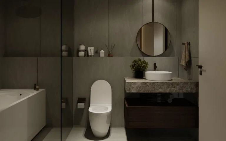 The modern bathroom reflects contemporary elegance, with quality fixtures, stylish tiling, and a layout designed for ease and comfort.