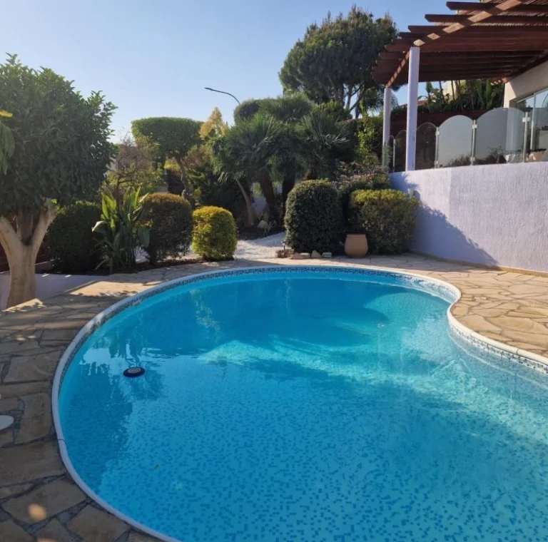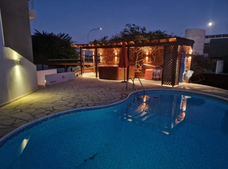 House for sale with panoramic view ,in Germasogeia area,Limassol. The land area is 660 m2, the living area is 300 m2, and there is also a 73 m2 veranda. The house was built in 2010 and includes five bedrooms and four bathrooms, two of which are en-suite. There is also a storage room, parking for two cars, a private swimming pool, a Jacuzzi and a steam bath. All rooms are equipped with air conditioning and underfloor heating. The house is surrounded by a well-kept garden, for sale with household appliances.