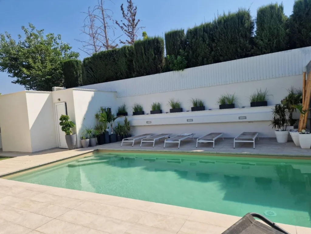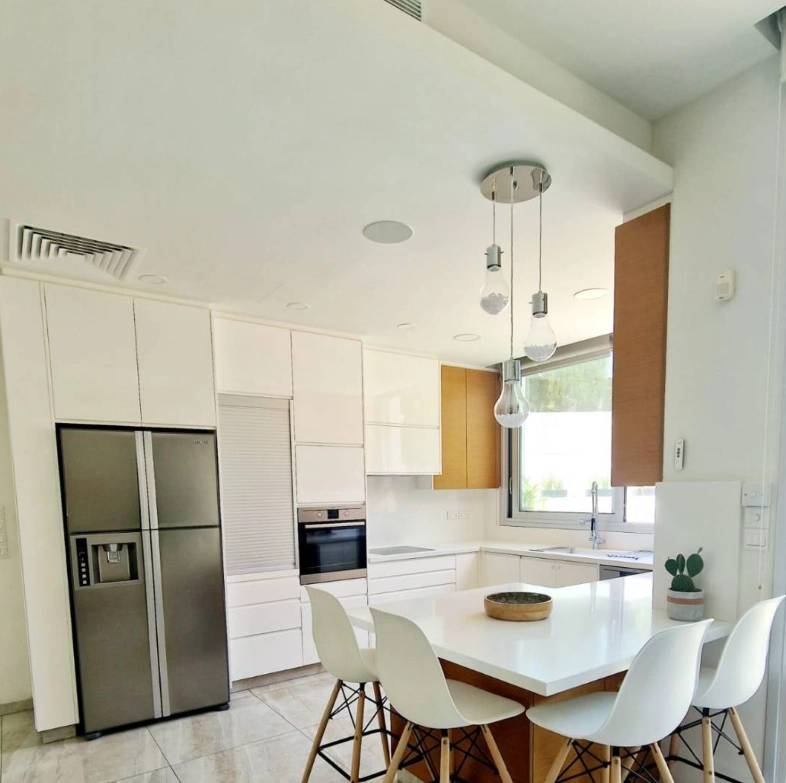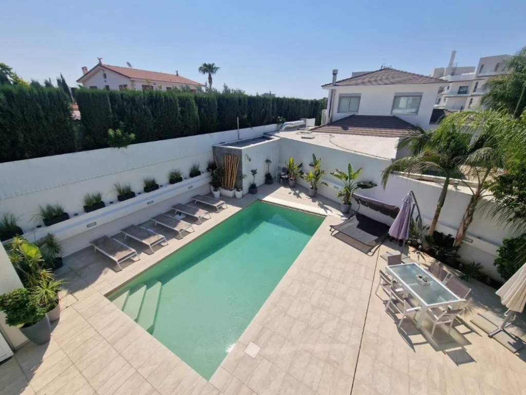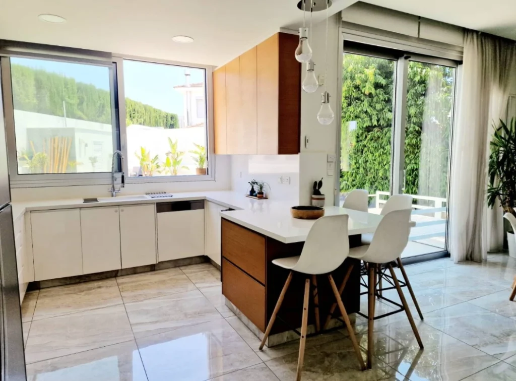 For sale unique split level Villa with sea views, located in the prestigious area of Agios Athanasios, built in 2008. The house is on a 696sm plot. The interior has 6 different levels. 4 bedrooms, 2 ensuite ( 1 of which has separate entrance but also a door connecting to the house. Can be used as maids room or guest room). There is also a room on the top floor that can be an office, game room, playroom or small gym. 2 car garage + outside covered parking, separate laundry room with 10 kilo washer / dryer, 2 sided fireplace, alarm system, underfloor heating, salt water swimming pool, fly screens, electric shutters in 2 bedrooms, Air conditioning in every room, parquet floors, marble, staircase, stainless Steel railing, automatic irrigation system connected to a well so you don’t pay for water for pool or garden, 5kw photovoltaic solar panels, water softener to be installed soon.