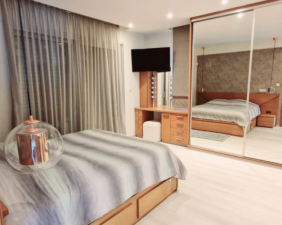 For sale unique split level Villa with sea views, located in the prestigious area of Agios Athanasios, built in 2008. The house is on a 696sm plot. The interior has 6 different levels. 4 bedrooms, 2 ensuite ( 1 of which has separate entrance but also a door connecting to the house. Can be used as maids room or guest room). There is also a room on the top floor that can be an office, game room, playroom or small gym. 2 car garage + outside covered parking, separate laundry room with 10 kilo washer / dryer, 2 sided fireplace, alarm system, underfloor heating, salt water swimming pool, fly screens, electric shutters in 2 bedrooms, Air conditioning in every room, parquet floors, marble, staircase, stainless Steel railing, automatic irrigation system connected to a well so you don’t pay for water for pool or garden, 5kw photovoltaic solar panels, water softener to be installed soon.