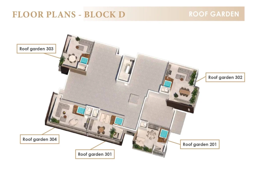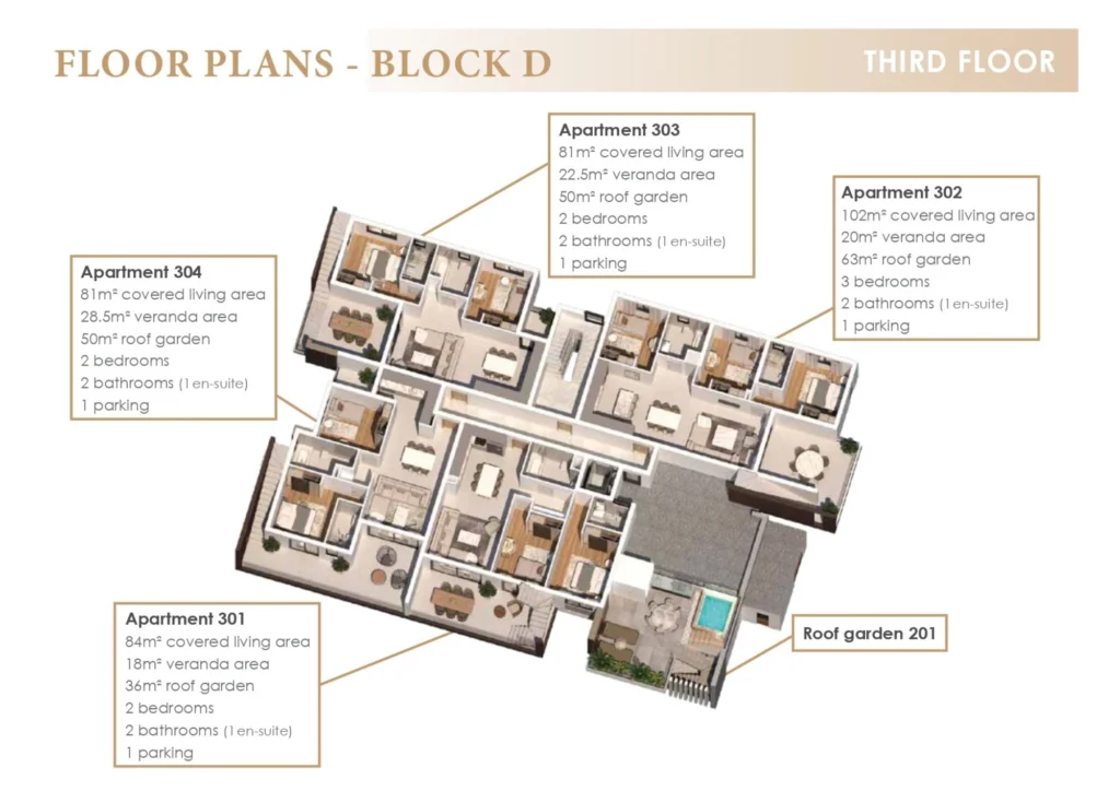 Two-bedroom penthouse 303, with a living area of 81 m² and a 50 m² roof garden, is located on the third floor of a three-storey building in Block D.