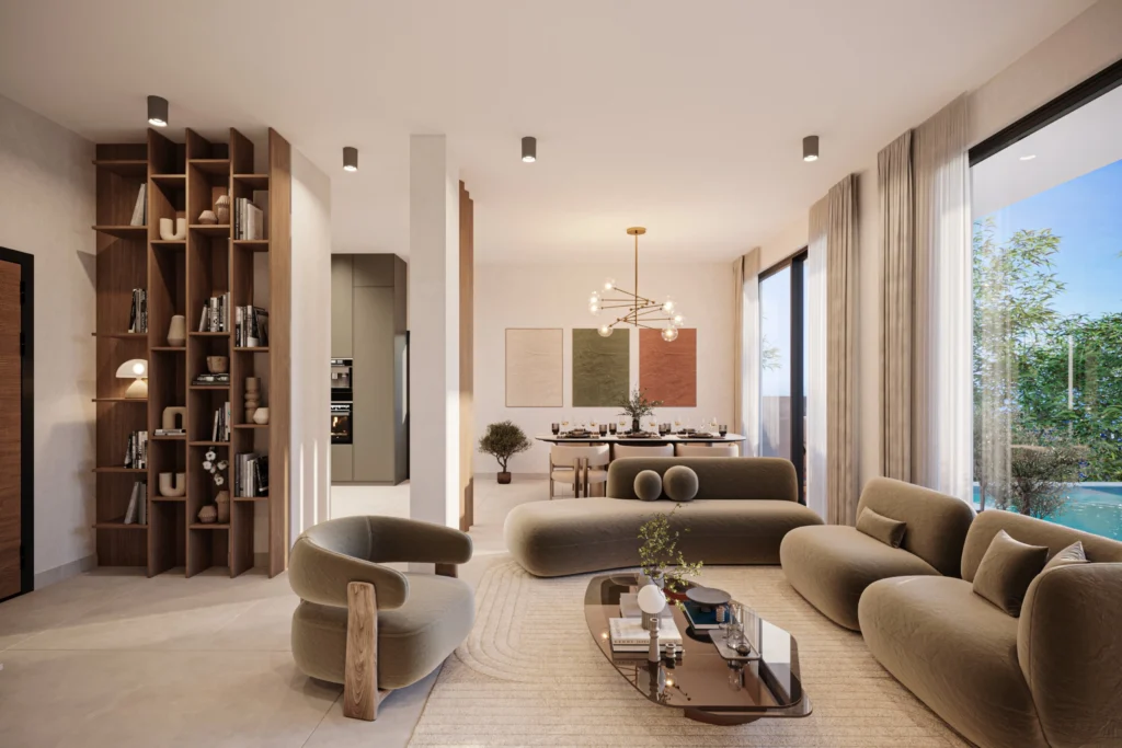 The villa features an open-plan layout with a spacious kitchen, dining, and living area, enhanced by large windows that flood the interiors with natural light. Bright, airy rooms connect seamlessly to outdoor spaces, while the generous plot provides plenty of room for entertaining, relaxation, or creating your own garden oasis.
