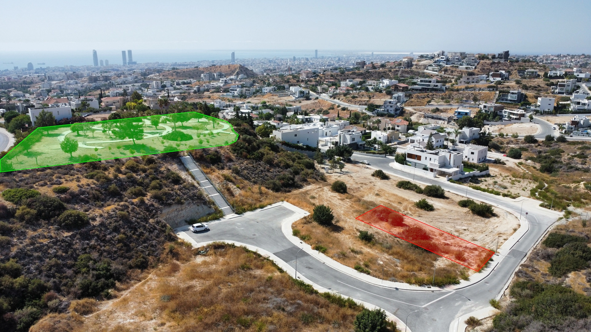 The plot enjoys a prime location just 5 minutes’ drive from main roads with full amenities—bus stops, gas stations, supermarkets, schools, and more—and only 10 minutes from the beach. Just 100m away, you’ll find a large park offering stunning sea and city views.
