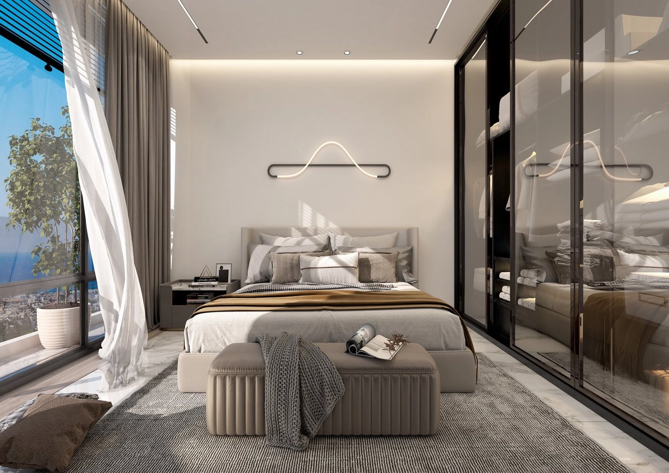 For sale off-plan 3-bedroom apartment in Pafos, on the 2nd floor of a 6-storey building with elevator. Internal space is 111.4 m2, featuring a bright open-plan kitchen and living area, two bathrooms, and large windows opening to a generous balcony. Set within a gated complex with a communal swimming pool, fully equipped gym, and landscaped grounds. Optional furnished.